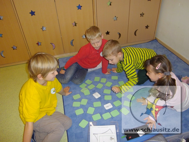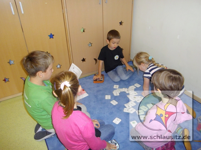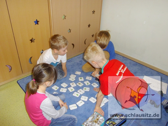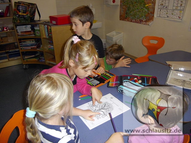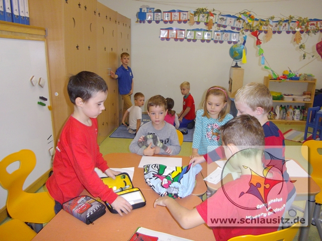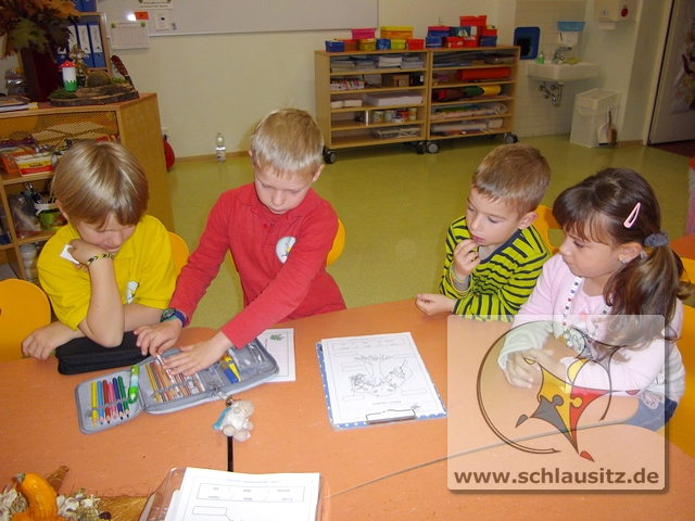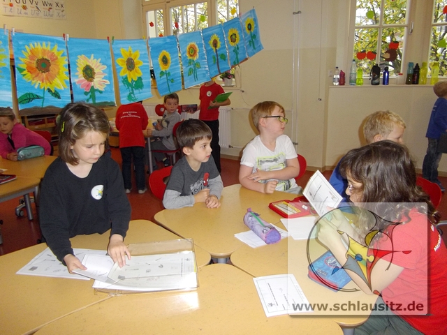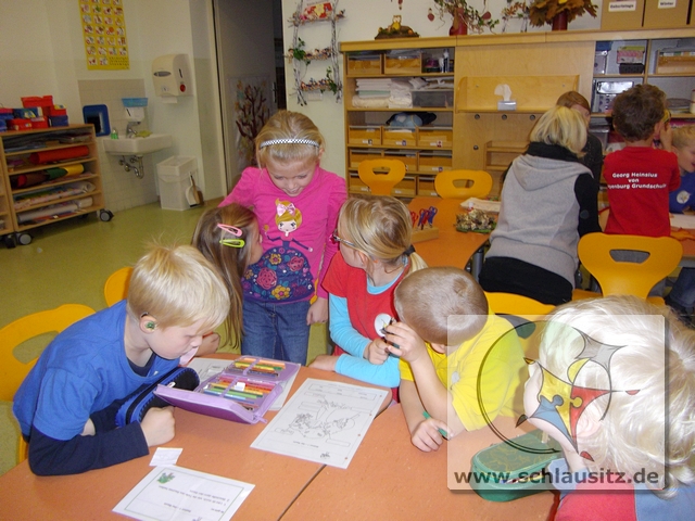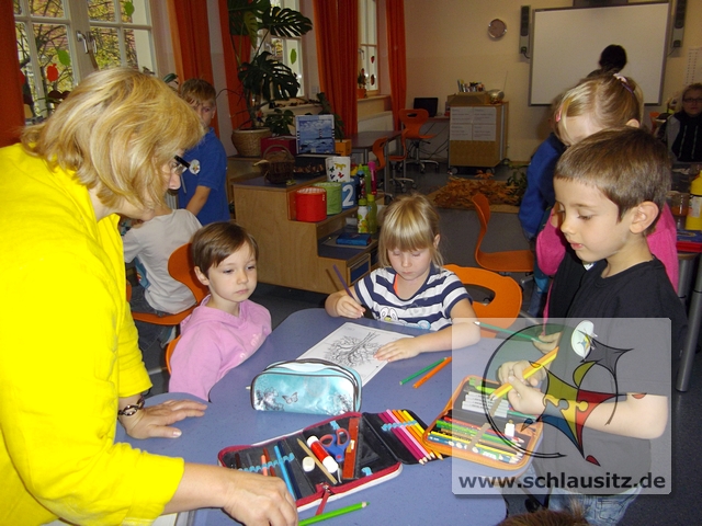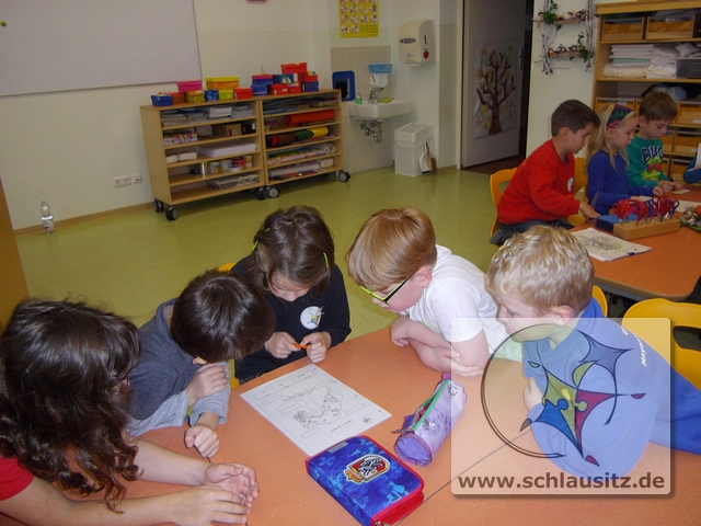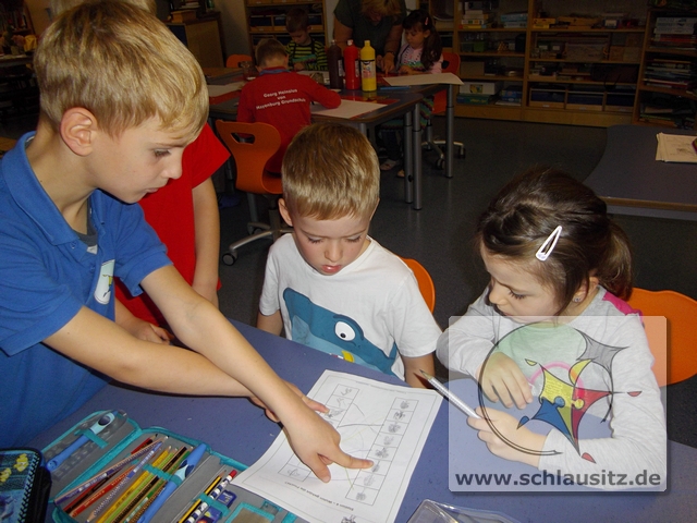 Nach der feierlichen Begrüßung konnte es endlich losgehen. Zuerst wurden die Kinder in gemischte Gruppen eingeteilt, die gemeinsam ihre Aufgaben lösen sollten. In allen drei Räumen warteten ganz verschiedene Aufgabenstellungen auf sie. Es wurde fleißig geklebt, gemalt, geschrieben und geraten.