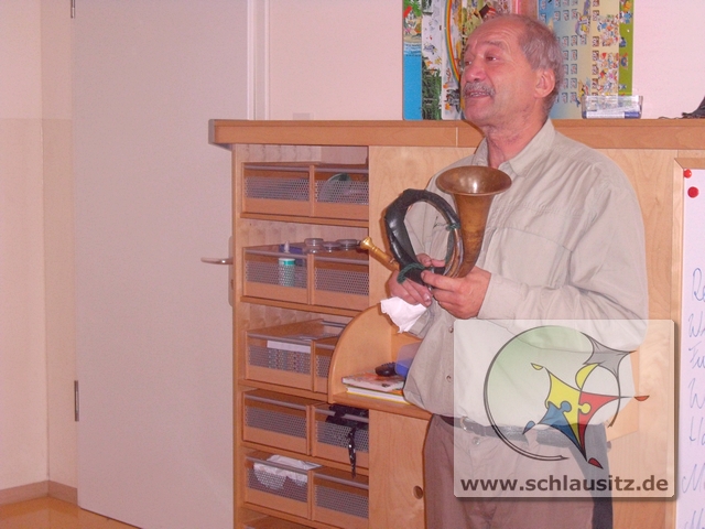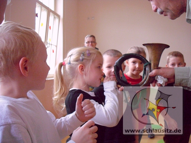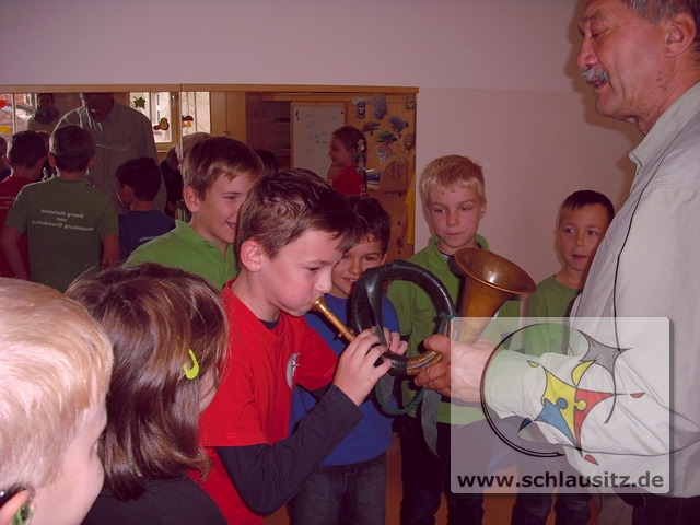 Zum Abschluss probierten alle Kinder in das Jagdhorn zu blasen. Dazu bedarf es einer besonderen Technik, die sich als gar nicht so leicht erwies. Mit Hilfe der geduldigen Anleitung des Försters, gelang es jedoch allen Kindern dem Horn einige Töne zu entlocken.