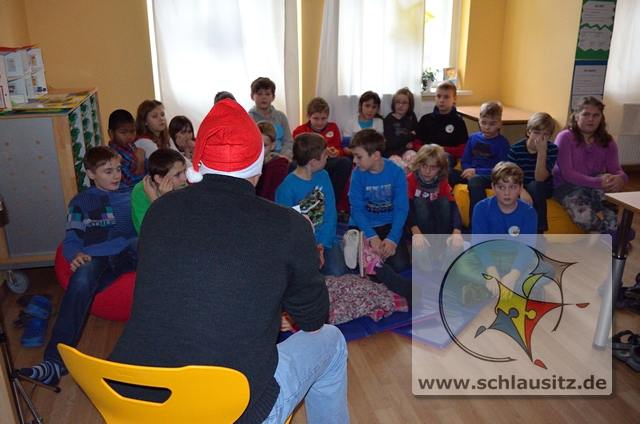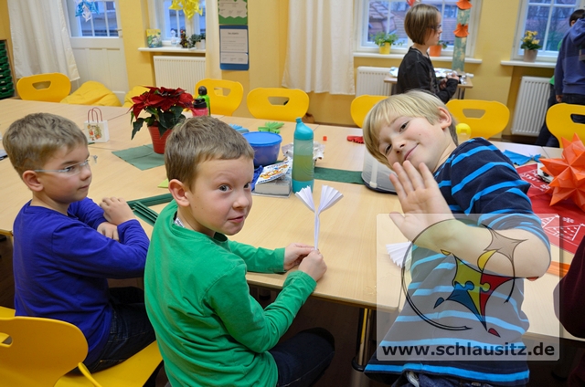 Als erstes bastelten wir kleine Engel aus Papier und Walnüssen bis uns der Weihnachtsmann besuchte. Ganz schön aufgeregt waren wir als er „Schneeflöckchen, Weißröckchen" anstimmte. Doch anscheinend war er mit unserer gesanglichen Leistung sehr zufrieden, denn es gab für jeden eine Überraschung. Nachdem wir unsere Geschenke ausgepackt hatten, gingen wir zum gemeinsamen Singen mit den Schülern der Uranus und Merkur Klasse in den Saal der Kaiserkrone. Das war eine tolle Idee von unseren Musiklehrern Frau Blumenthal und Herrn Apelt. Nach dem Frühstück erwartete uns schon ein weiteres Highlight. Herr Oswald, der Papa von Melvin, hatte schon alles für eine Märchenstunde vorbereitet. Wir machten es uns auf den Sitzsäcken gemütlich und genossen das Vorlesen von einem orientalischen und einem chinesischen Märchen. Abschließend zeigte uns Melvin sein Können beim Flötespielen und Emma und Nele präsentierten uns einen Tanz. Alles in allem war es eine gelungene Weihnachtsfeier und wir konnten voller Vorfreude in die Ferien starten.