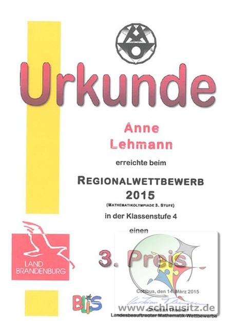 Am 14. März 2015 veranstaltete das Steenbeck-Gymnasium in Cottbus den Regionalwettbewerb (3. Stufe) der Mathematik-Olympiade. Auch Anne Lehmann erhielt eine Einladung, da sie die Kreisrunde der Olympiade gewonnen hatte.