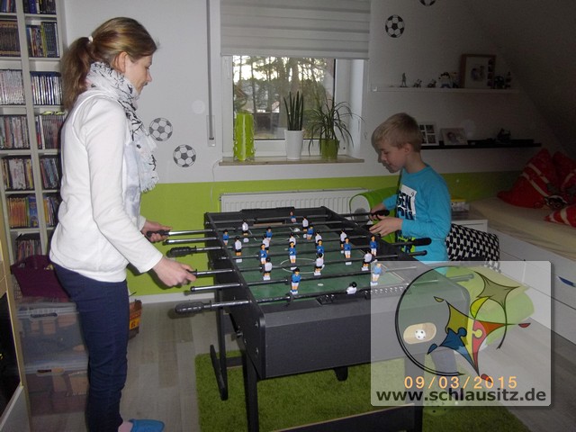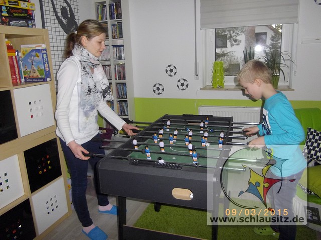 Luca wartete schon gespannt auf das Klingeln an der Tür. Als es dann soweit war, zeigte er ihr sofort sein Zimmer. Dort entdecke Frau Ludwig den Tischkicker und forderte Luca zu einer Soccerpartie heraus. Ein munteres Spielchen begann, bei dem es Luca nicht gelang, sich entscheidend abzusetzen. Frau Ludwig stellte ihre ungeahnten Soccerqualitäten unter Beweis. Beim letzten Angriff wurde das Spiel dann mit 10 : 9 für Luca entschieden.
