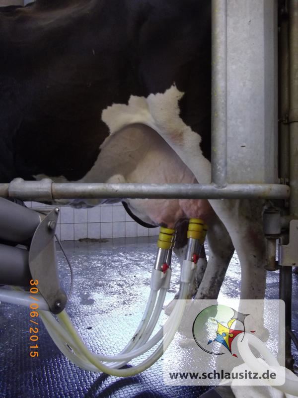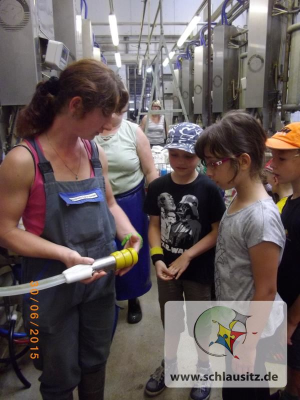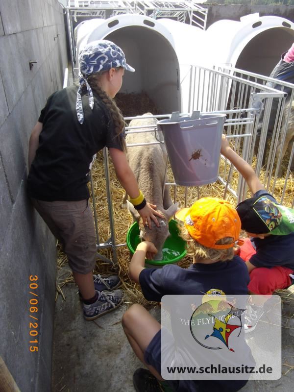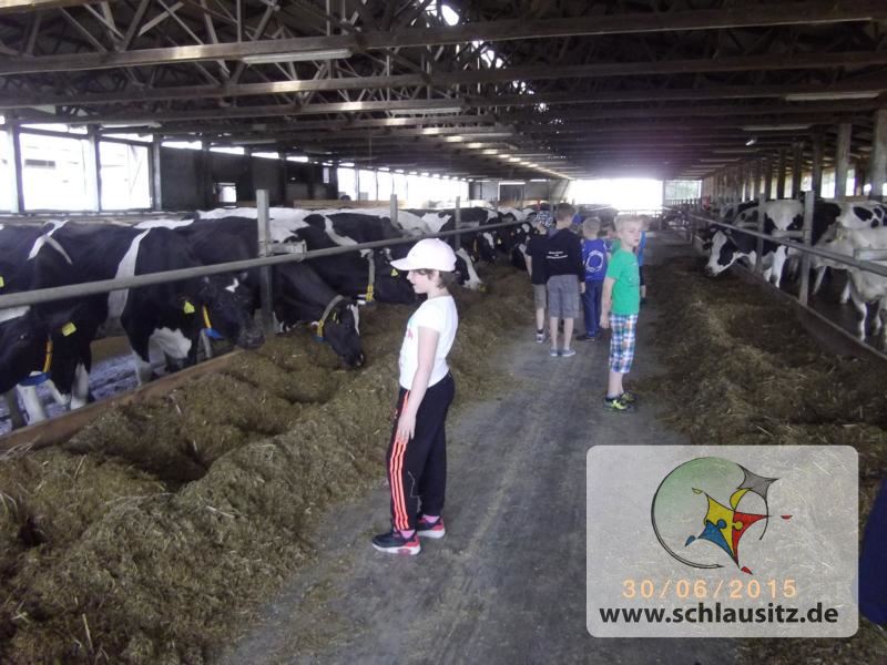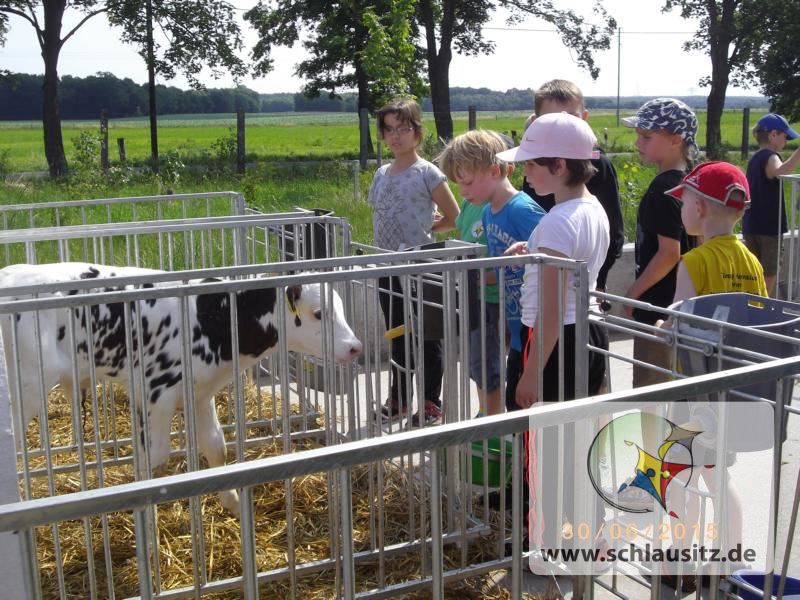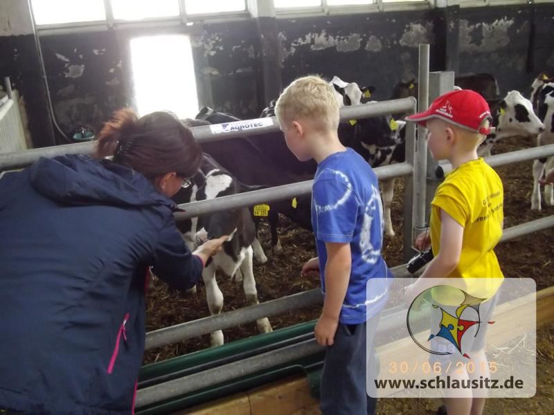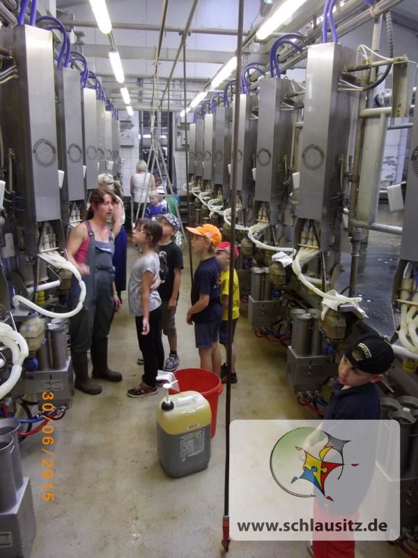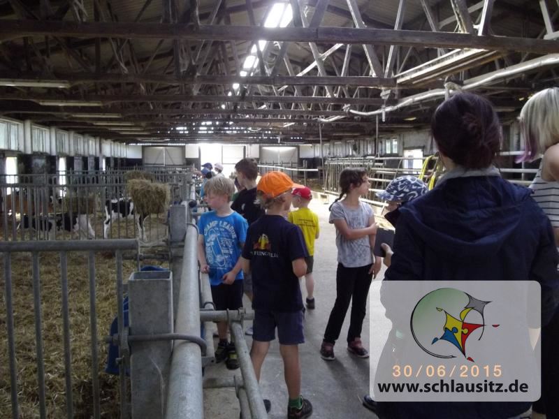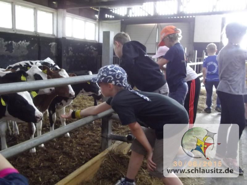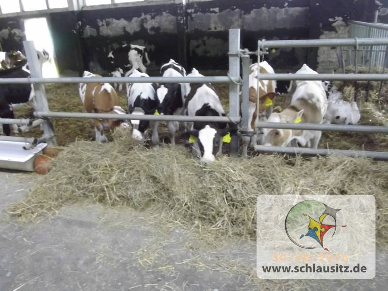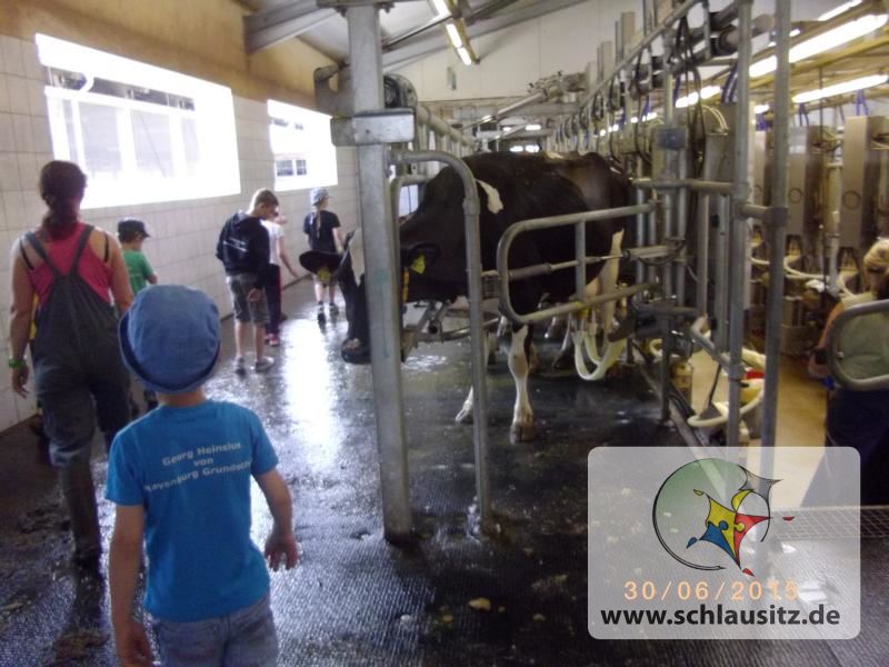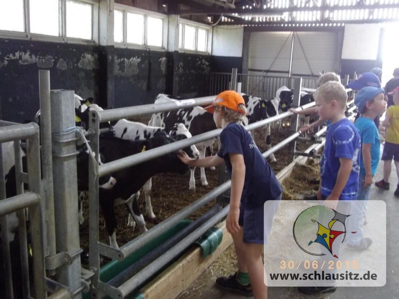 Dann hieß es erst mal frühstücken! Die Familie hatte für uns einen großen Pavillon mit Sitzgarnituren aufgebaut und darunter nahmen wir gemütlich unsere Lunchpakete, die uns Herr Reeck mitgeschickt hatte, ein. Gut gestärkt ging es für eine Runde auf das Trampolin und anschließend auf die Wanderung zur Milchviehanlage. Vor Ort wurden wir von der Mitarbeiterin Sandy empfangen. Sie zeigte uns die komplette Anlage, bei den neugeborenen Kälbchen angefangen bis hin zur Melkanlage, bei der wir zuschauen konnten, wie gerade eine Kuh an der Maschine gemolken wird. Ein tolles Erlebnis war natürlich die Kühe zu füttern und zu streicheln.