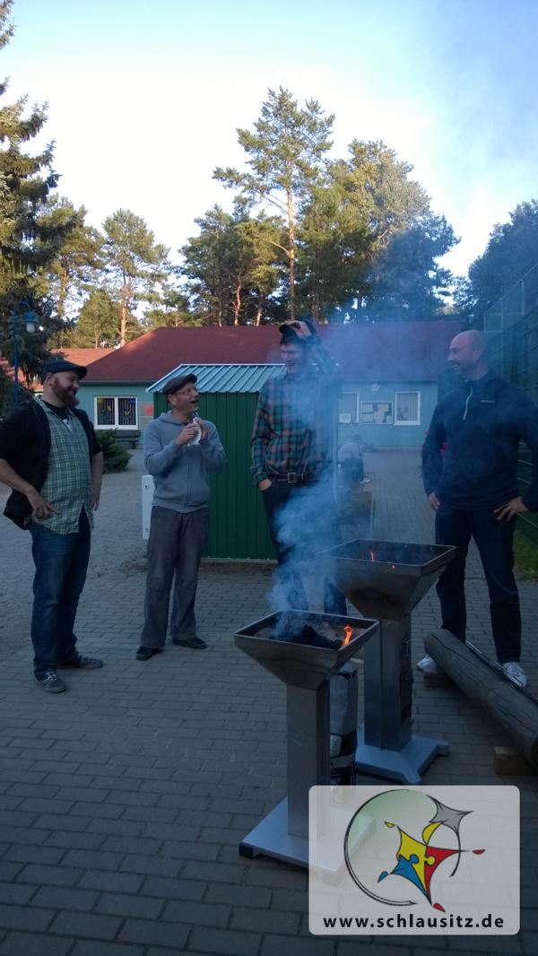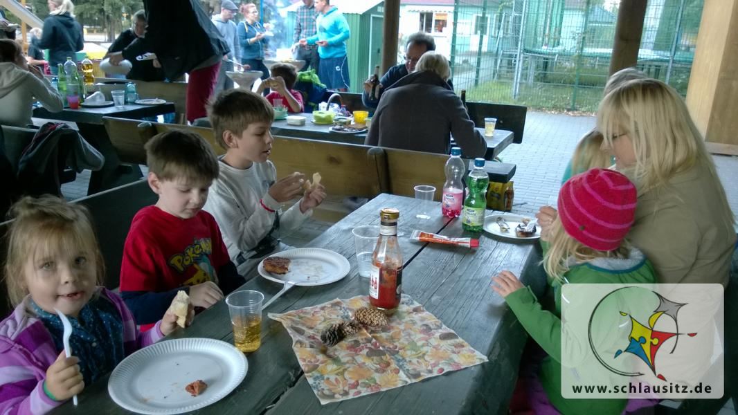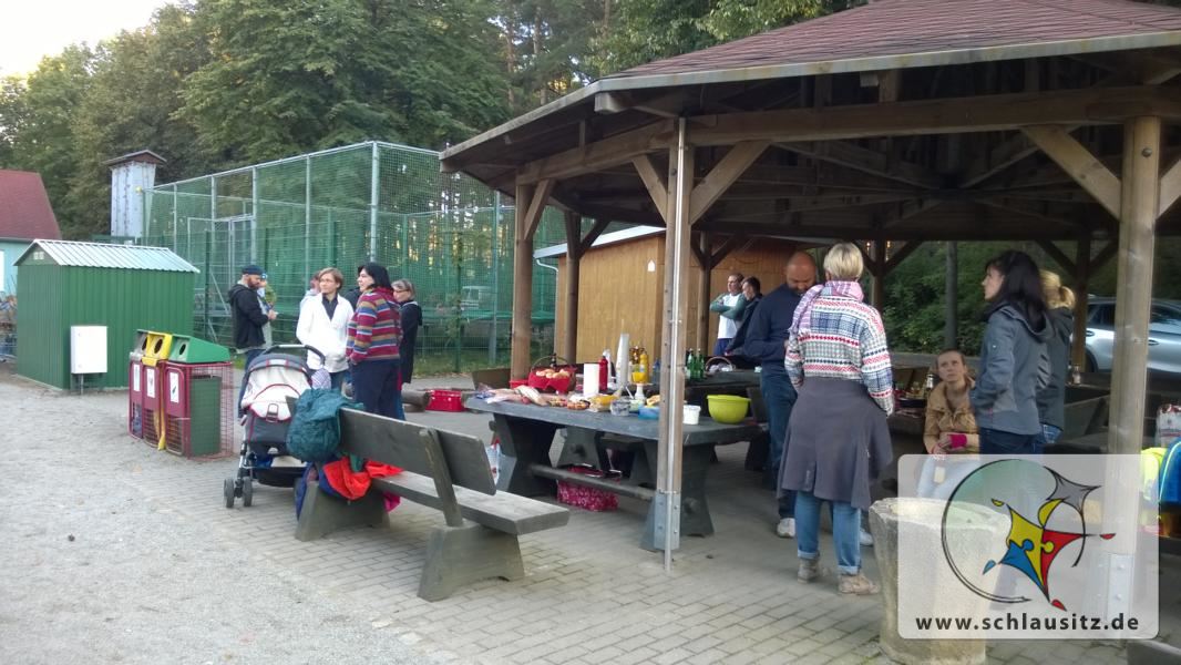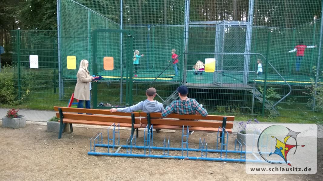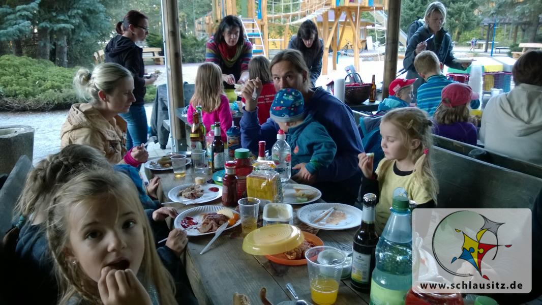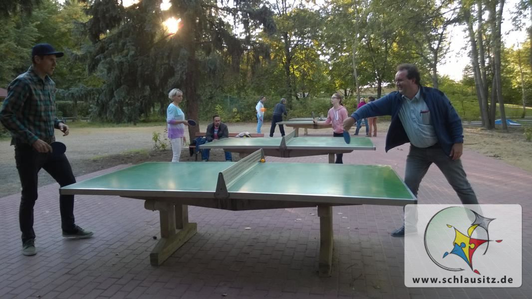 Dem sirenenhaften Quaken des blauen Familienparkfrosches Froggi folgend, kam es zu einem nicht ganz gewöhnlichen Konvent. Auf dem Gelände der Spiel- und Sportanlagen des Familienparks in Großkoschen tummelten sich ungewöhnlich viele Menschen für einen Montagnachmittag in der Schulzeit. Zwischen Minigolfanlage, Kegelbahn, Trampolins, Kletterseilen, Rutschen und Tischtennisplatten jagten schreiende Jungs kreischenden Mädchen hinterher. „Und jetzt zu gleich“ hörte man es vom Trampolin schallen und sechs Kinder blieben scheinbar für einen kurzen Moment in der Luft stehen. Derweil versuchten die Erziehungsberechtigen dieser freiheitsliebenden Nachkommenschaft ins Gespräch zu kommen. Und so bildeten sich, am Rande des Geschehens, ständig wechselnde Grüppchen. Über den gepflegten Smalltalk hinweg konnte man ernsthaft privaten, die Schule betreffenden und aber auch albernen Gesprächen folgen. Nur einen Steinwurf entfernt sprangen Mütter, Väter, Geschwister und eine Handvoll mutiger Kinder, sich gegenseitig „beschnippelnd“ und „beschmetternd“, um eine Tischtennisplatte. Einmal mehr war zu spüren wie Sport und Bewegung, Türen öffnen, Eis schmelzen und Sympathien wecken kann. Gegessen wurde auch. Frei nach dem Prinzip des gerne Gebens, zauberten sich die Familien gegenseitig ein kleines Festmahl auf den Tisch, bei dem kein Bauch leer blieb.