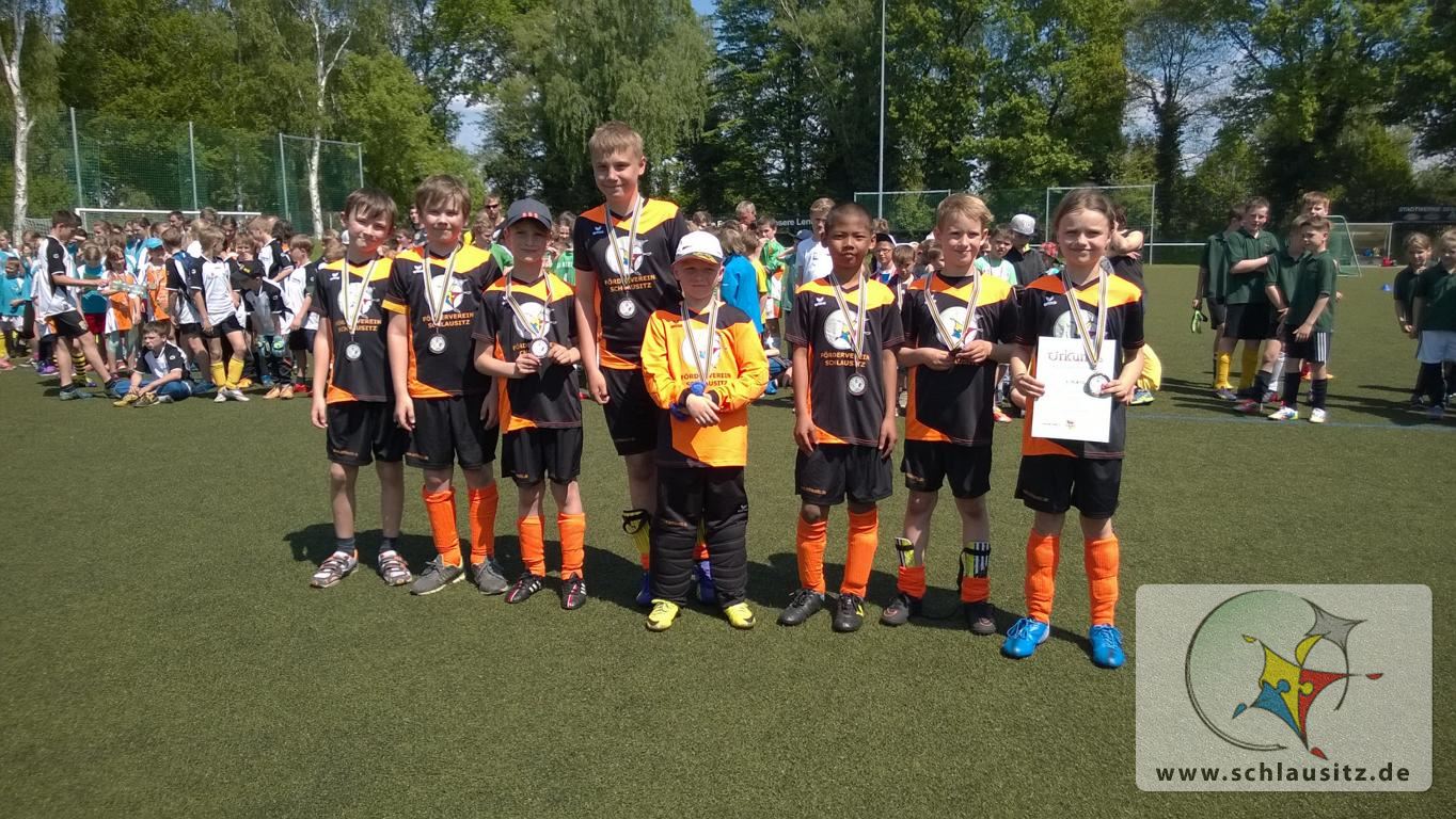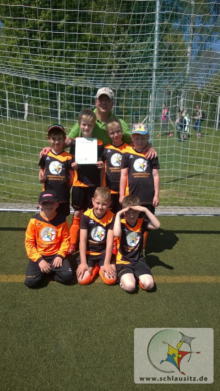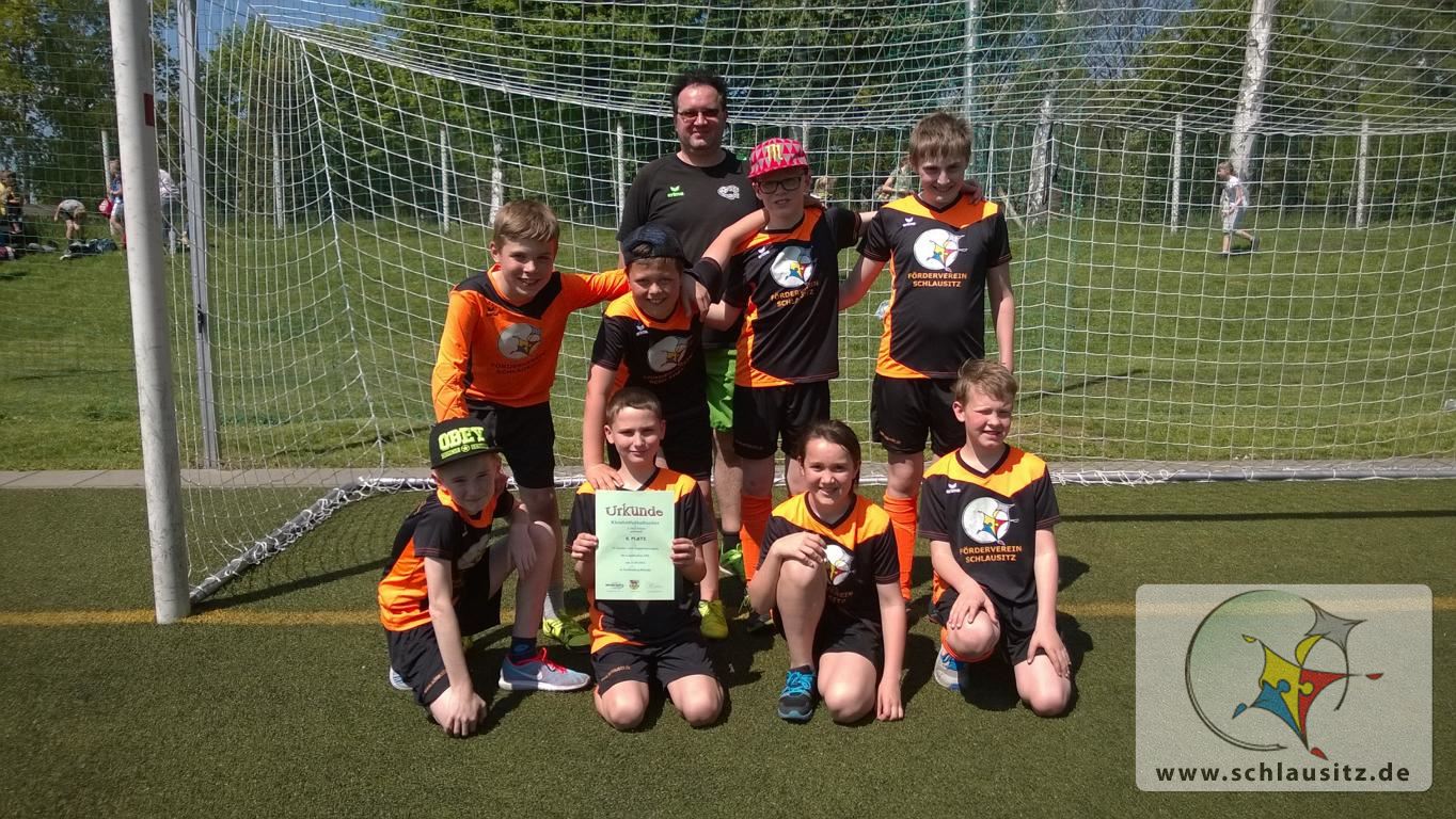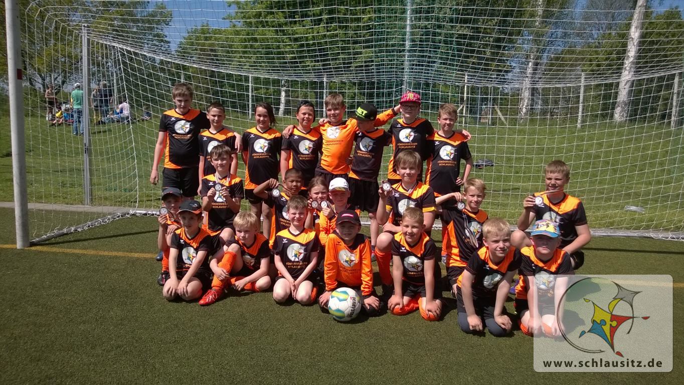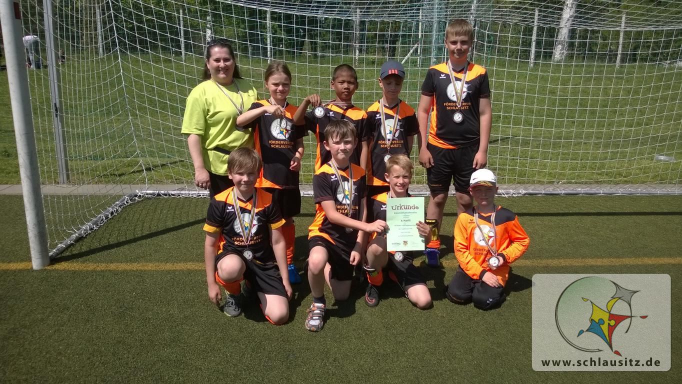 Unsere 1/2-Klässler hatten es mit 5 weiteren Kontrahenten zu tun. Dieses junge, unerfahrene Team, mit nur zwei (!) aktiven Fußballern hatte sich im Vorfeld über 2 Trainingseinheiten, mit viel Freude und Elan auf die Meisterschaft vorbereitet. Und dementsprechend hochmotiviert startete man in das erste Match und machte auch sofort ernst. Til Ballat erzielte bereits in der 2. Spielminute die 1:0-Führung. Nachdem man zwischenzeitlich mit 1:2 in Rückstand geriet, wurden nochmal, angefeuert vom Trainer an der Seitenlinie, alle Kräfte mobilisiert. Folgerichtig erzielte unser Kapitän Luca Schmidt mit dem Schlusspfiff den hochverdienten Ausgleich, der im Laufe des Turniers nochmal einen sehr hohen Wert haben sollte. Die nächsten 2 Spiele gingen dann leider etwas unglücklich mit 1:2 bzw. 0:1 verloren. Am Schluss warteten die zwei hochfavorisierten Mannschaften aus der Waldschule Lauchhammer bzw. der Regenbogengrundschule aus Senftenberg, welche komplett gespickt mit aktiven Fußballern des FSV Lauchhammer, Chemie Schwarzheide, des FSV Brieske Senftenberg und des Senftenberger FC antraten. In beiden Spielen haben unsere Jüngsten mit viel Kampf das eigene Tor verteidigt und nicht mehr als 3 Gegentore zugelassen. Andere Schulen mussten da weitaus höhere Niederlagen hinnehmen. Am Ende war die Freude über einen 5.Platz sehr groß. Man hatte das große Ziel erreicht, nicht Letzter zu werden.