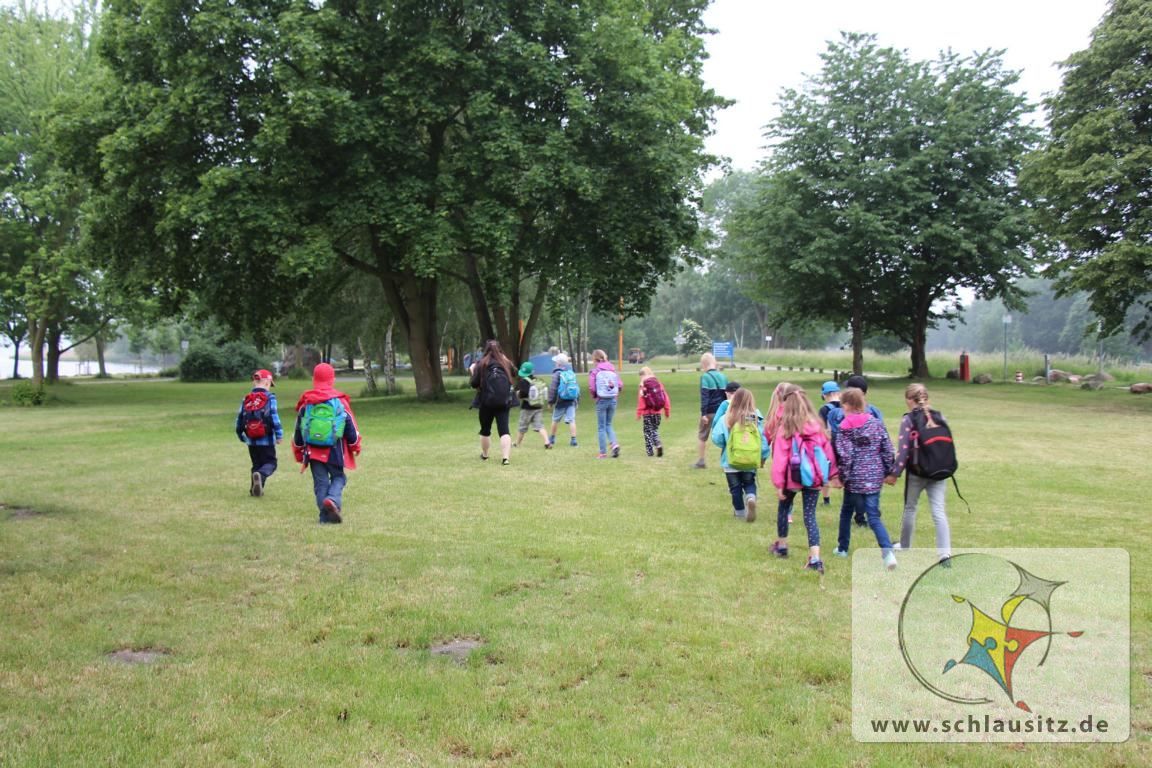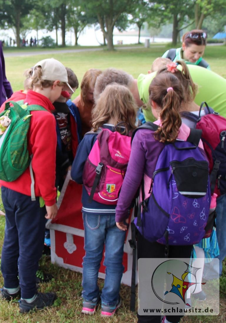 Am Senftenberger Hafen starteten alle Klassen eine Schnitzeljagd in moderner Ausführung mit Geocache-Elementen und vielen Rätseln, die auf dem Weg zur Schatzkiste erfolgreich gemeistert werden mussten. Jede Klasse erhielt altersgerechte Aufgaben aus den unterschiedlichsten Bereichen (Zahlenrätsel, Rechenaufgaben, Bilderrätsel, Orientierungen mit dem Kompass oder dem GPS-Gerät, englische Kreuzworträtsel). Auf dem Gelände versteckte „Caches“ mussten gefunden werden.