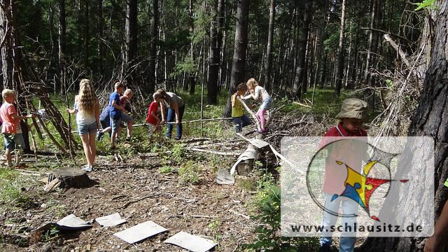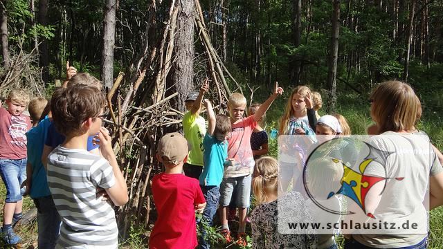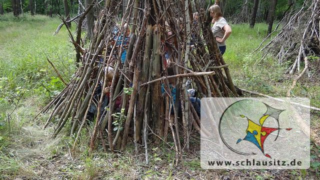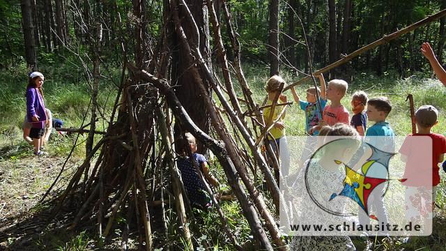 Der Nachmittag begann mit einer gemeinsamen Vesper der Kinder, die anschließend zu einer 2-stündigen geführten Entdeckungstour durch die Umgebung aufbrachen. Unter Leitung des pädagogischen Personals vom Erlebniscamp haben die Kinder eine Hütte aus Holzstöcken gebaut. Das fördert die Teamfähigkeit und Ausdauer und ganz nebenbei hat es auch noch riesigen Spaß gemacht. Als Abschluss durften die Kinder dann noch Naturmaterialien sammeln und als Erinnerung mit nach Hause nehmen.