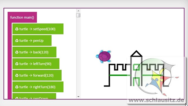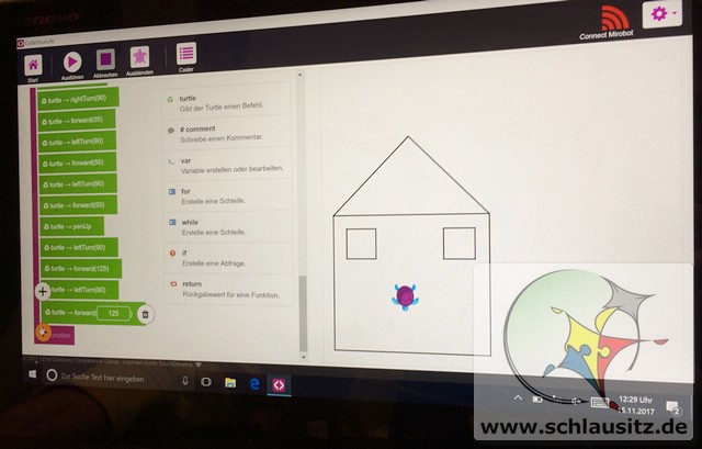 Mithilfe der Programmiersprache Logo und den sogenannten Turtle-Grafiken eignen sich die Kinder erste Programmierkenntnisse an, um bereits nach kurzer Zeit eigene beeindruckende kleine Kunstwerke auf die Bildschirme zu zaubern und diese anschließend vom Zeichenroboter Mirobot aufs Papier bringen zu lassen. Je nach Kenntnisstand der Teilnehmenden geschieht dies mit einfachen Befehlsfolgen oder Skripten mit Schleifen bis hin zu Variablen und Unterfunktionen. Sofortige Ergebnisse und Resultate fördern dabei die Selbstwirksamkeitserfahrung und machen Lust auf mehr. Seien es selbst programmierte Muster, Kristallformen, Mäander oder sogar Fraktale.
