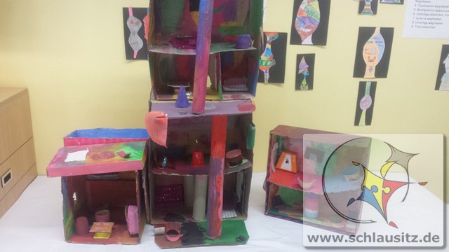 Häuser nach Friedensreich Hundertwasser zu bauen ist gar nicht so schwer. Die 4. Klassen haben das im Kunstunterricht einmal ausprobiert. Dabei mussten sie auf folgende Dinge besonders achten: Hundertwasser hat seine Häuser immer bepflanzt.