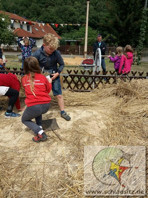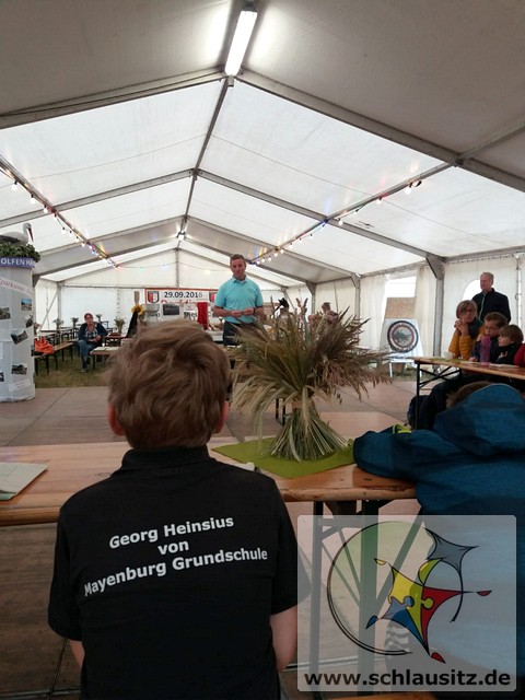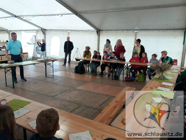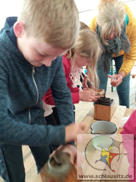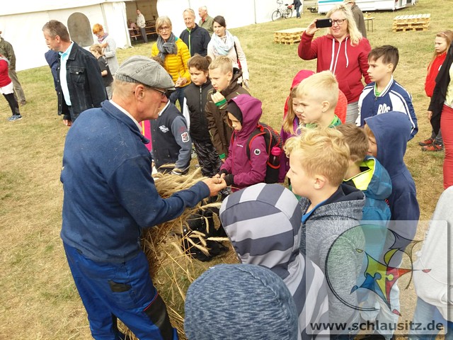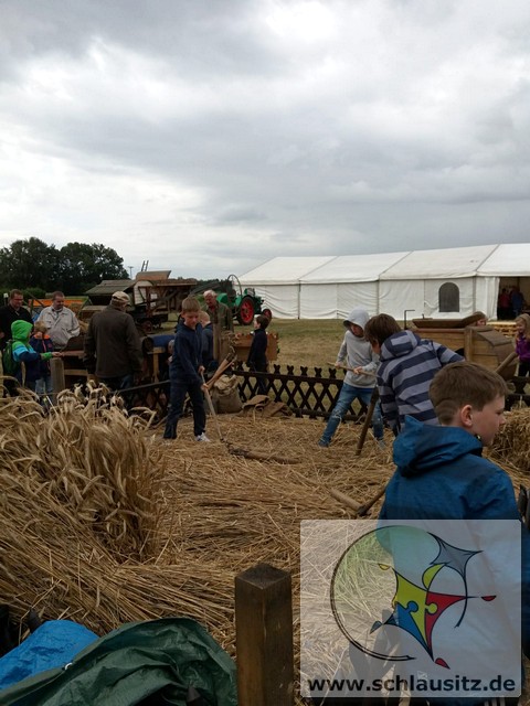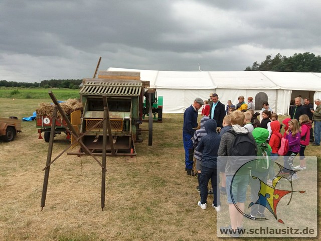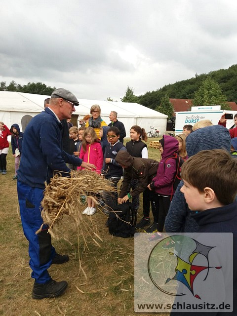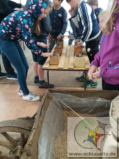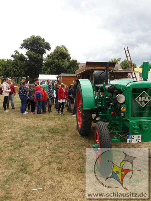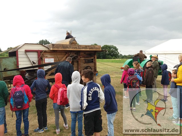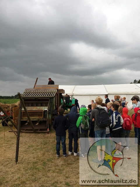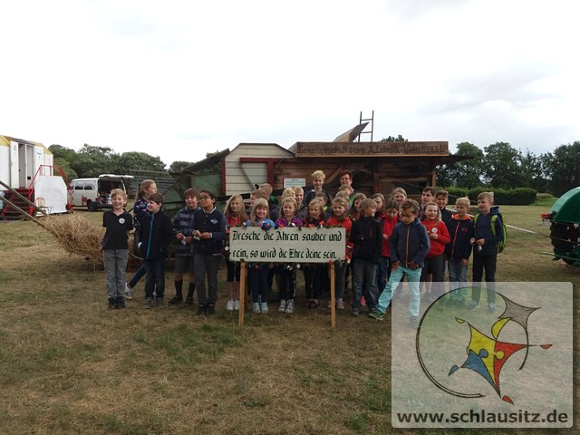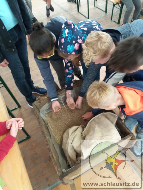Früh ging es gleich los, wir sind bis nach Brieske-Dorf gelaufen. Als wir ankamen haben wir ein tolles Frühstück bekommen. An jedem Platz lag für jedes Kind ein kleines Geschenk. Später haben wir uns einen Vortrag zum Thema "Vom Korn zum Brot" angehört, wo wir dann auch unser Wissen testen konnten. Wir konnten auch zusehen, wie die Dreschmaschine das Getreide drischt. Mit den fertigen Körnern durften wir anschließend in einer Kaffeemühle die Körner zu Mehl mahlen, jeder durfte sein Mehl mitnehmen. Draußen konnte man mit einem Erwachsenen Mähdrescher fahren und man konnte sich an verschiedenen Geräten ausprobieren. Es war ein toller Ausflug. Wir bedanken uns beim Dorfclub Brieske-Dorf für diese erlebnisreichen und interessanten Stunden.
