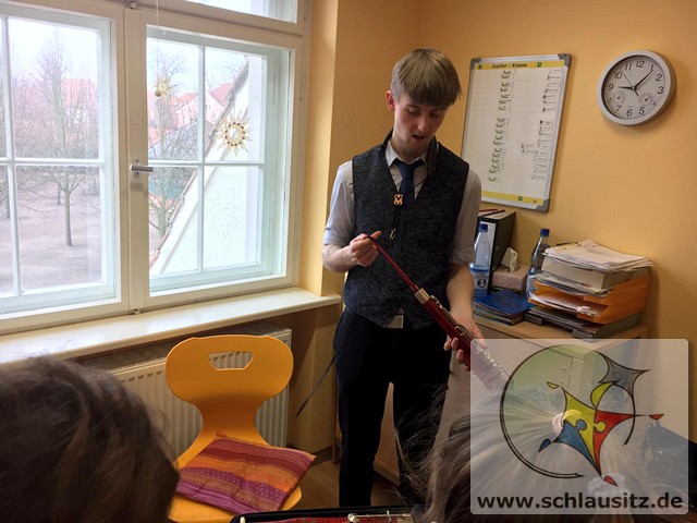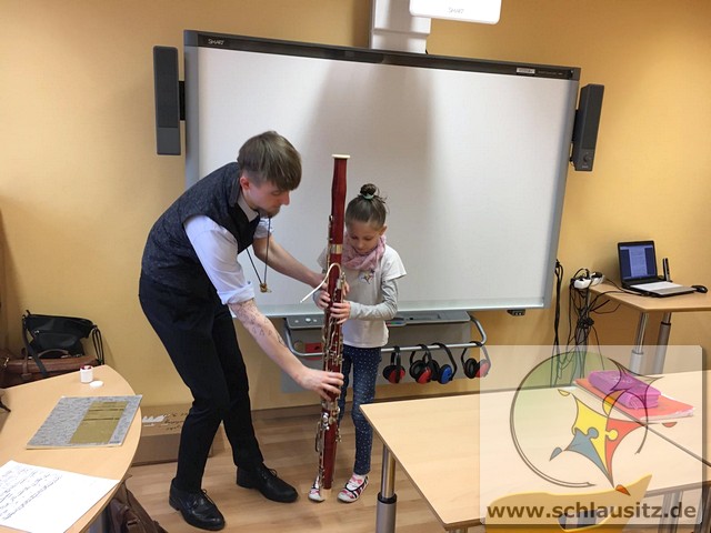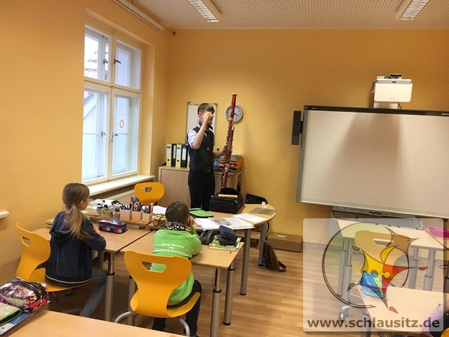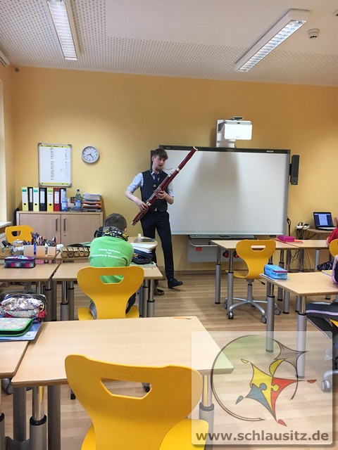 Die Schüler der Jupiter-, Uranus- und Merkurklasse hatten in ihrem Unterricht die Gelegenheit, sein Instrument, das Fagott, kennenzulernen. Herr Kornexl stellte den Aufbau des Instrumentes vor, gab einige Hörproben und beantwortete geduldig die Fragen der Schüler. Besonders interessant fanden alle, dass er seine Mundstücke aus Bambusrohr selber baut.
