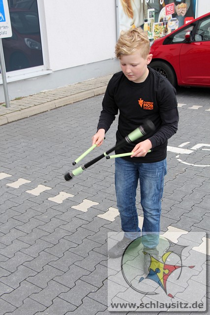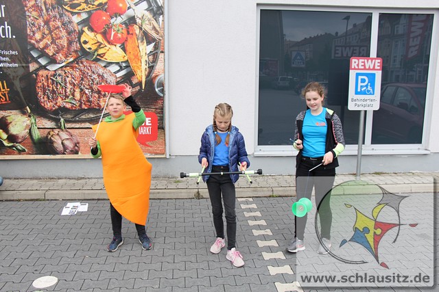 Am 10.05.2019 trafen sich die Schülerinnen und Schüler der 5. und 6. Klasse um 8:00 Uhr auf dem Schulhof ihrer Schule. Wir packten alle Materialien für den Carrotmob zusammen, die wir in den vergangenen Wochen vorbereitet hatten (Plakate, Flyer und Deko). Um 8:30 Uhr fuhr uns ein Bus zum REWE Markt von Familie Radke. Als wir dort ankamen, bereiteten wir die Stationen vor. Das waren unter anderem ein Kuchenstand mit leckeren selbst gebackenen Kuchen, eine Infostation, Kinderschminken und mehrere Zirkus Attraktionen.