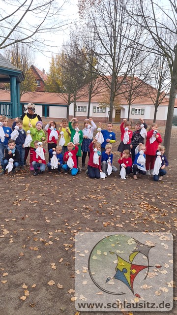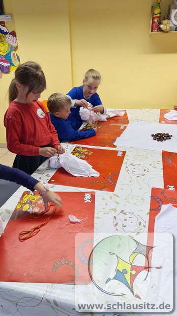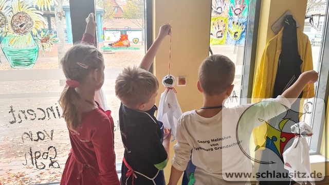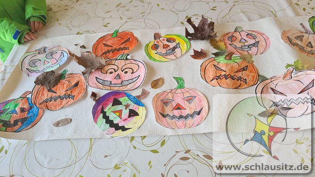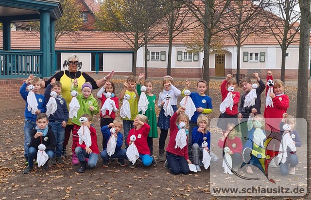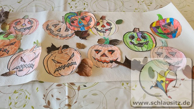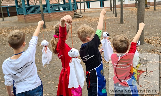 Aus altem Leinentuch, gefüllt mit selbst gesammelten Kastanien als Kopf, kreierten die Kinder lustige Gesichter auf ihre Geister. Ein tolles Mitbringsel, zum Aufhängen im eigenen Zuhause zum Halloweenfest, sind dabei entstanden.