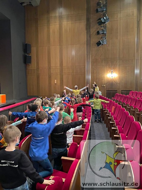 Nach dem Museumsbesuch wurde es musikalisch für die Kinder der Saturn- und Neptunklasse. Bei einem Besuch des Theaters „Neue Bühne“ in Senftenberg konnten sich die Kinder in der Schulaufführung „Mit Pauken und Trompeten“ von dem musikalischen Talent einiger Tiere überzeugen. Angefangen vom Löwen, über Elefanten und Schildkröten bis hin zum Kuckuck zeigten die Tiere ihr Können und animierten die Kinder zum Mitmachen. Durch die fantastische musikalische Darbietung eines Streichquartetts wurde deutlich, wie mit Hilfe von Musik Bilder erschaffen werden und die Fantasie angeregt werden kann. Am Ende des Stückes tauchten die Kinder in eine zauberhafte Unterwasserwelt ab und bewegten sich als Unterwasserpflanzen in den Wellen des Meeres.