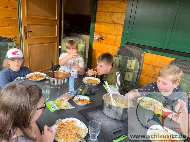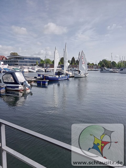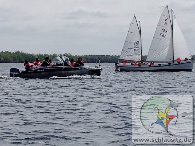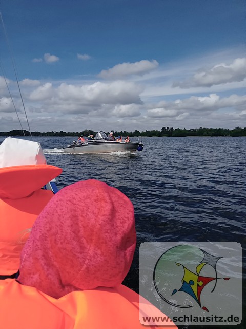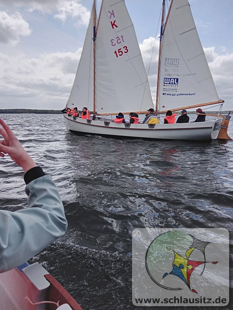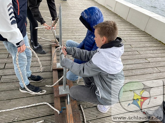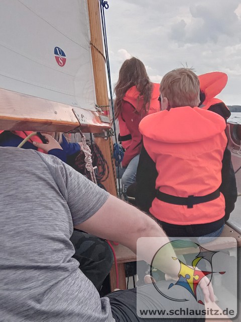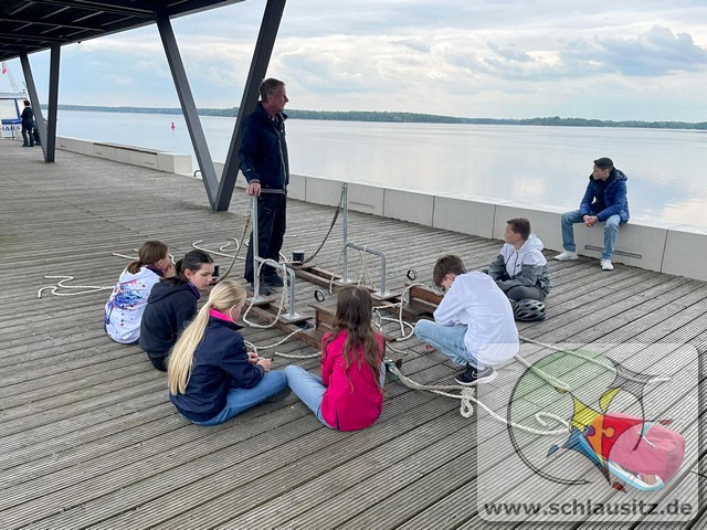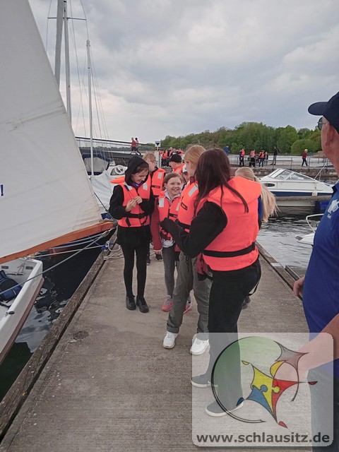 Am ersten Tag fuhren wir um den ganzen See mit Halt am Senftenberger Hafen, um dort ein erstes Schnuppersegeln und einen Hafenrundgang zu unternehmen. Die nächsten Tage ging es von Großkoschen immer mit dem Fahrrad zum Stadthafen, um dort zu segeln, Theorie und Knotenkunde zu machen. In Großkoschen wohnten wir in Bungalows und mussten uns immer Frühstück und Abendessen selber zubereiten. Wochen vorher beschäftigten wir uns schon im Unterricht damit, planten das Budget, schrieben Einkaufslisten und sind am Freitag vor der Klassenfahrt sogar selber einkaufen gegangen. Nachmittags, wenn die Bungalows aufgeräumt waren, hatten wir Freizeit. Da durften wir selbständig auf den Spielplatz gehen. Am letzten Tag durften einige Kinder zum Abschluss der Segelwoche mit dem Motorboot fahren.