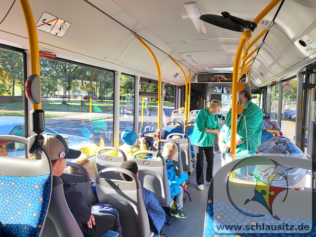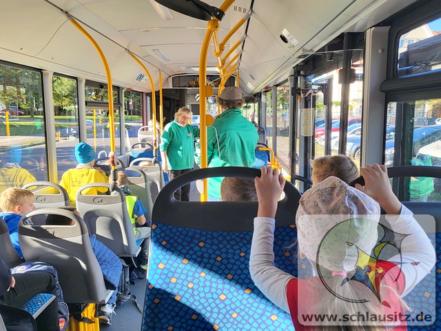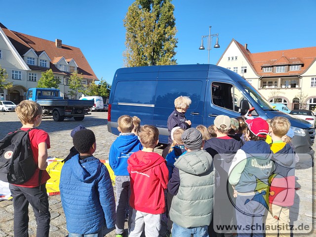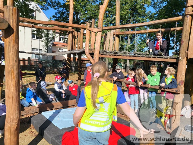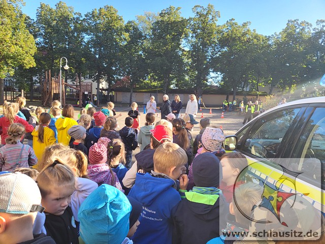 Der Eintritt in die Schule oder der Beginn eines neuen Schuljahres nach den Sommerferien geht für viele Kinder auch mit der selbstständigen Bewältigung ihres Schulweges einher. Einige Schülerinnen und Schüler fahren mit dem Bus, andere kommen mit dem Fahrrad zur Schule, wiederum andere laufen zu Fuß oder werden mit dem Auto gebracht. Alle Kinder haben jedoch gemein, dass sie sich mehr und mehr selbstständig im Straßenverkehr bewegen und sich als Teilnehmer des Straßenverkehrs wahrnehmen müssen. Um unsere Schlausitzer optimal auf den Straßenverkehr vorzubereiten und sie zu sicheren Verkehrsteilnehmern zu erziehen, fand in der letzten Septemberwoche unser alljährlicher Verkehrssicherheitstag auf dem Gelände der Kita Naseweis statt. An verschiedenen Stationen, welche unter anderem von den Sechstklässlern in mühevoller Arbeit vorbereitet wurden, konnten sich die Schülerinnen und Schüler der Jahrgangsstufen 1 bis 5 über Themen des Straßenverkehrs informieren und ihr Wissen überprüfen. So konnten die Mädchen und Jungen zum Beispiel die stabile Seitenlage üben und noch einmal etwas über Erste-Hilfe-Maßnahmen erfahren. Der Blick in ein Polizeiauto oder das Motorrad der Polizei ließ viele Schülerinnen und Schüler staunen. Die Kinder der Jahrgangsstufe 1/2 durften zudem eine Fahrt mit einem Linienbus absolvieren und auch mal auf dem Fahrersitz eines Fahrzeuges Platz nehmen, um zu erkennen was es mit dem toten Winkel auf sich hat. Nach diesem spannenden und lehrreichen Tag sind unsere Schlausitzer nun bestens für ihren Schulweg vorbereitet.