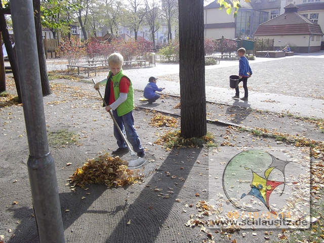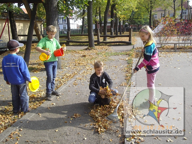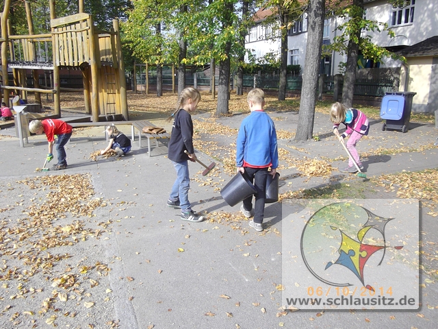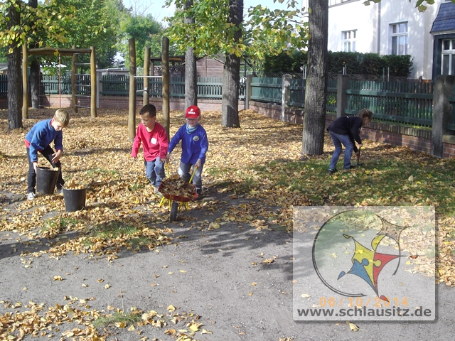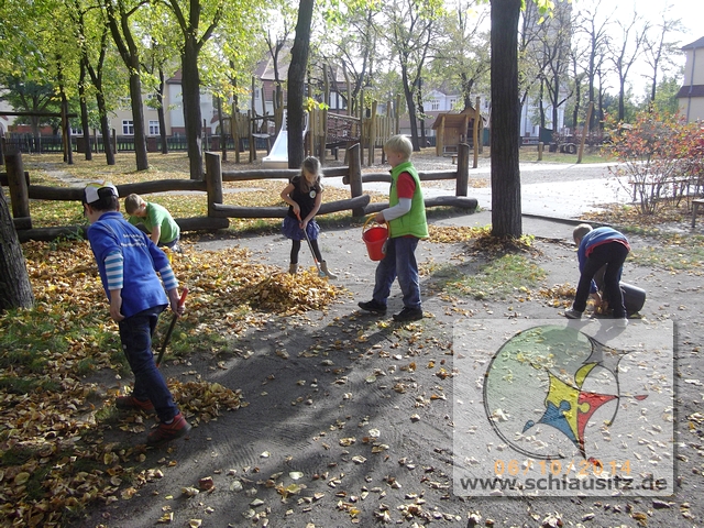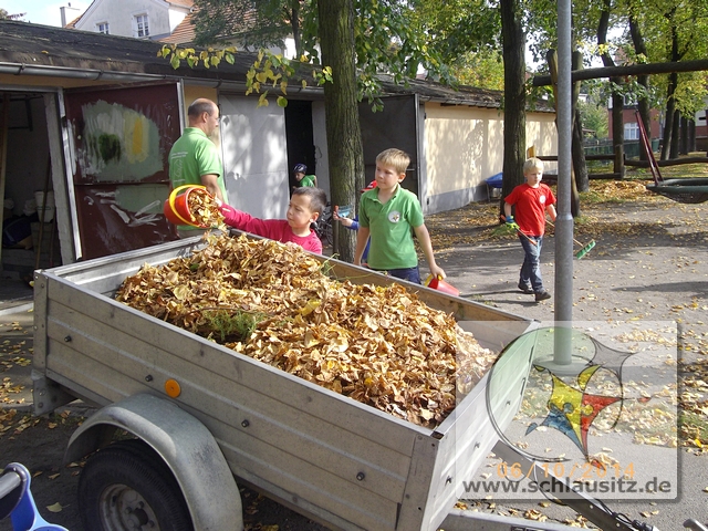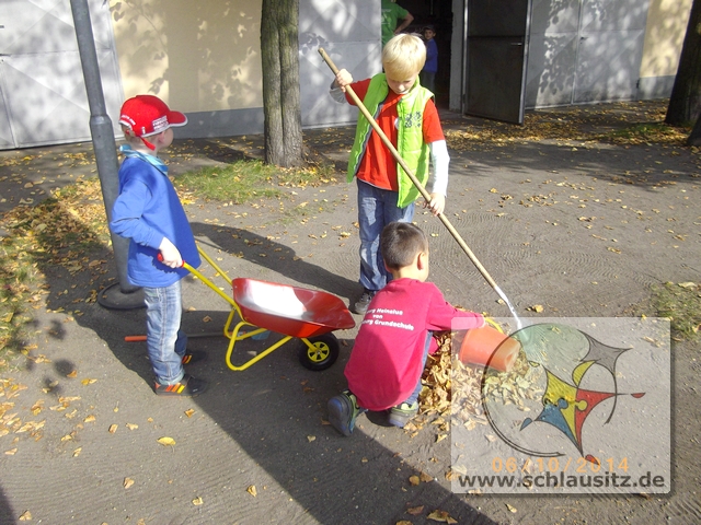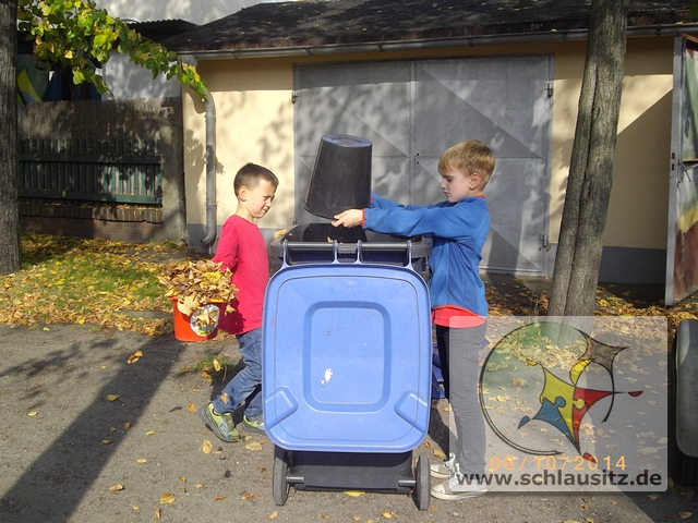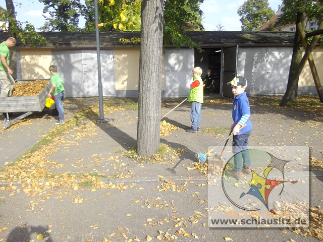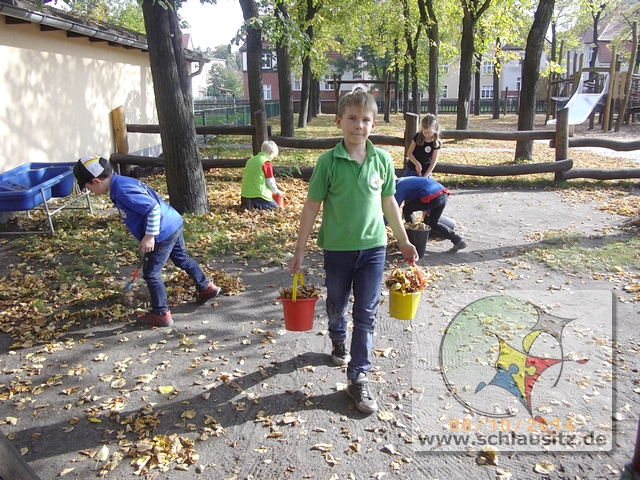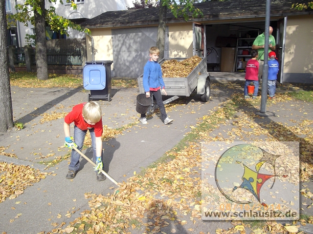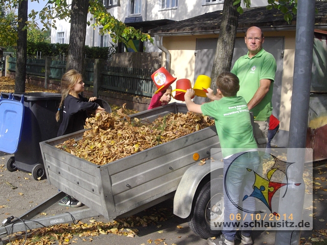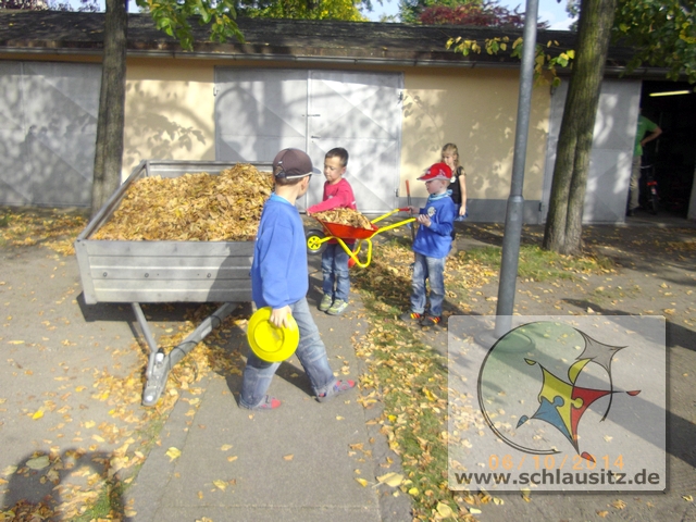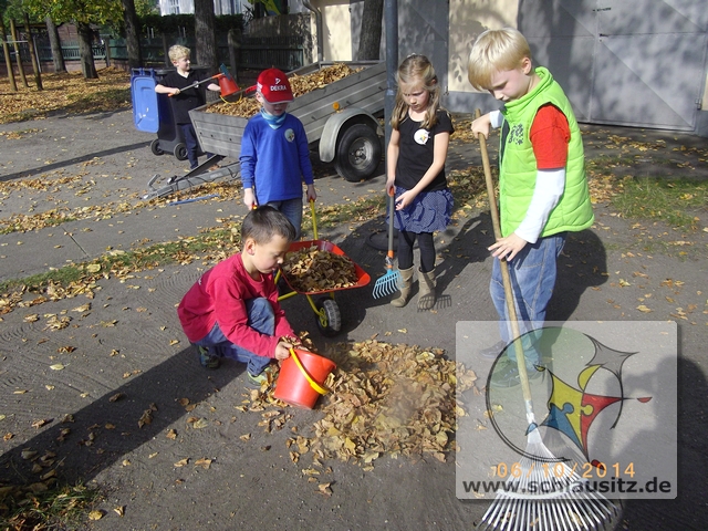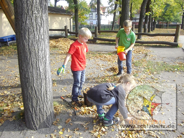 Mit viel Elan und Ehrgeiz ging es während der Hortzeit an die Arbeit. Die Hausmeister, Herr Glaser und Herr Schulze, freuten sich über die große Unterstützung und stellten uns einen großen Anhänger und eine Tonne zur Verfügung, in dem wir das Laub hinein schütten konnten.