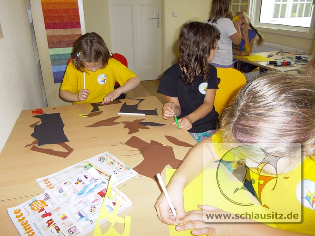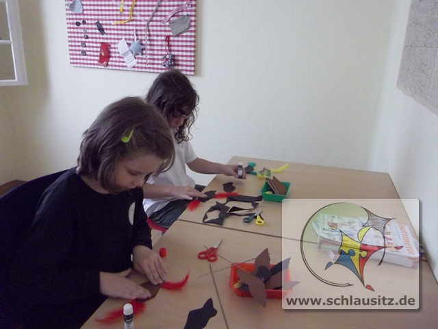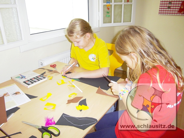 Zuerst wurden die einzelnen Teile, wie Körper, Flügel und Schnabel auf Tonpapier aufgemalt und ausgeschnitten, anschließend haben wir den Schnabel und die Augen auf den Körper aufgeklebt.