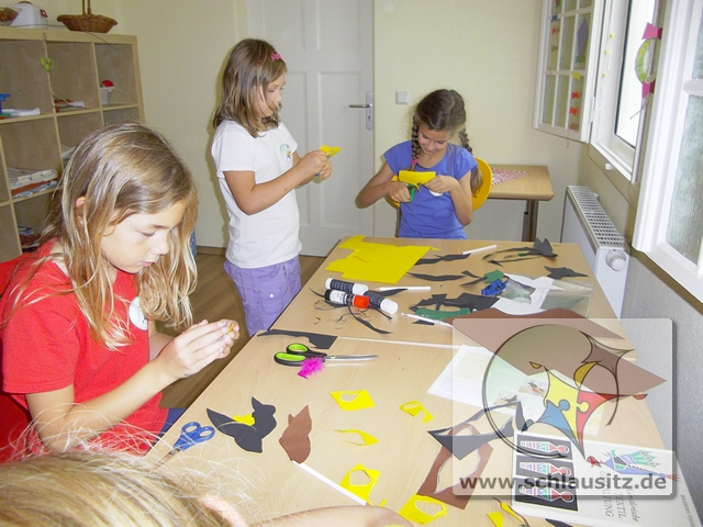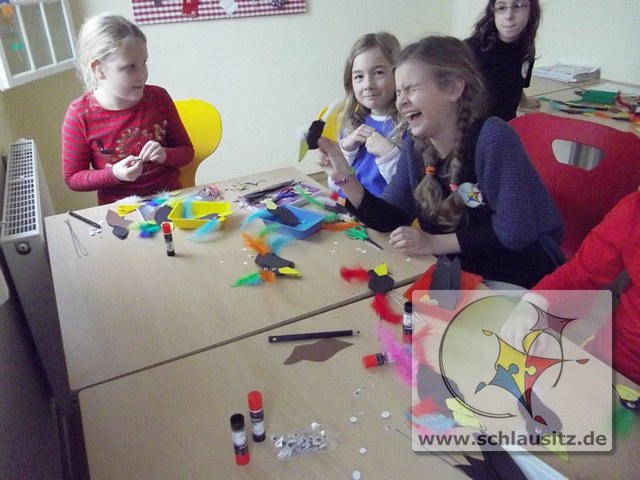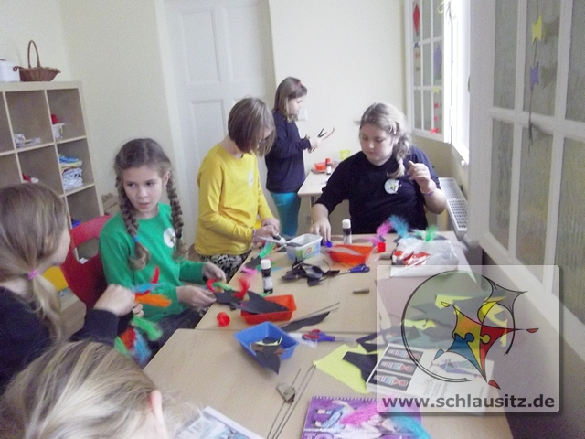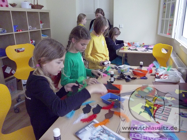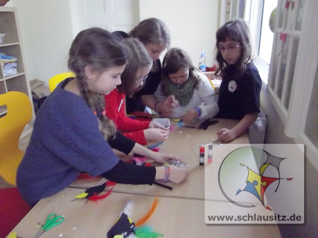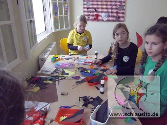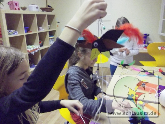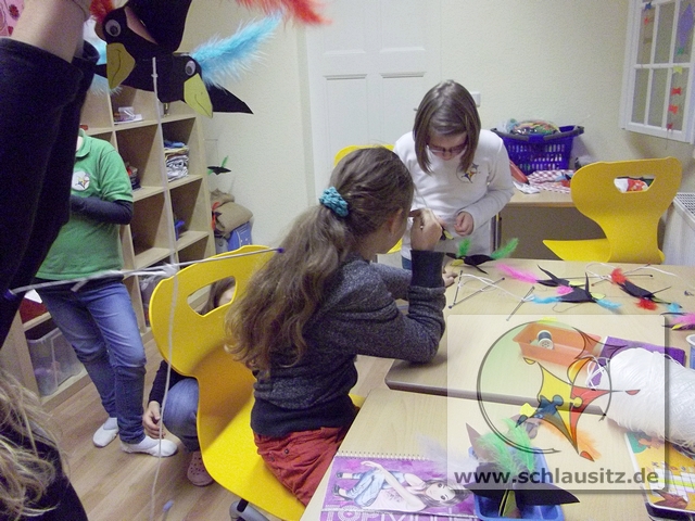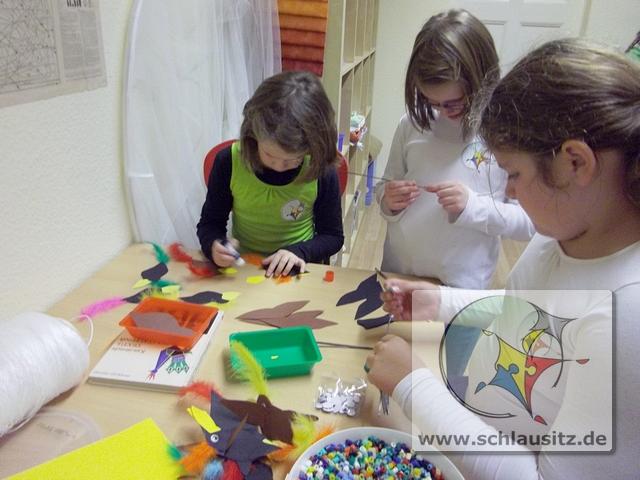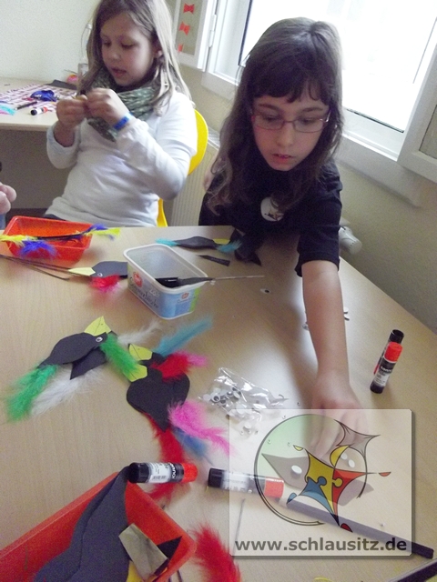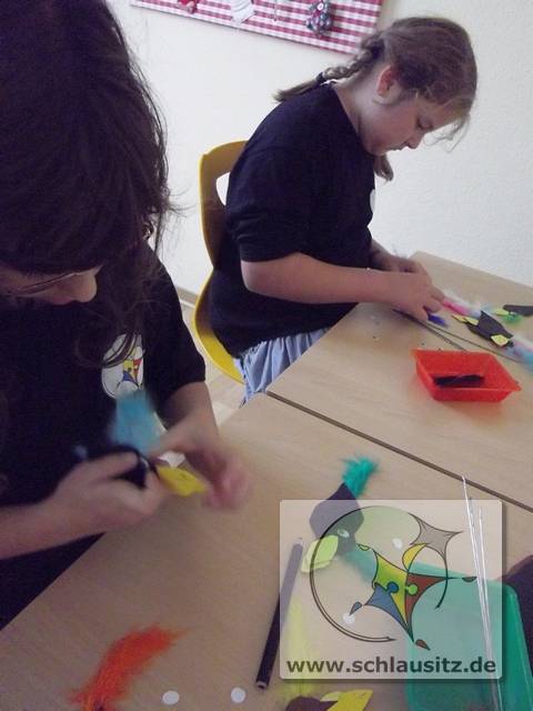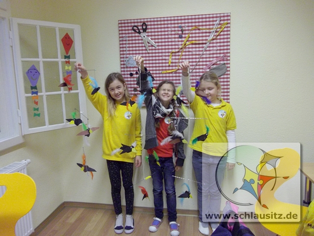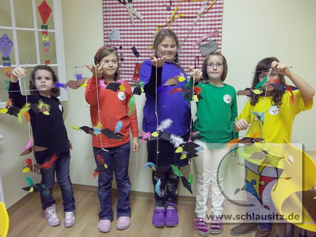 In der AG „Heinzelmännchen ganz groß" bastelten wir ein Mobile mit bunten Vögeln.