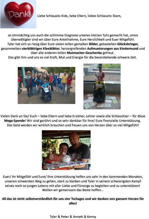 Euer/ Ihr Mitgefühl und Eure/ Ihre Unterstützung helfen uns sehr in den kommenden Monaten, unseren schwersten Weg zu gehen, stark zu bleiben und Tyler in seinem schwierigsten Kampf seines noch so jungen Lebens mit aller Liebe und Fürsorge zu begleiten und zu unterstützen!