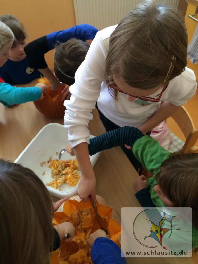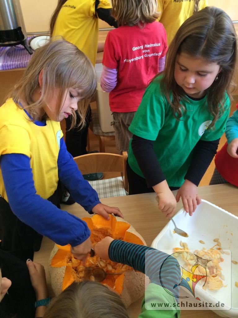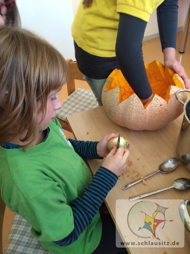 Aus dem Kürbisfleisch kochten wir eine leckere Suppe. Jedes Kind bekam eine kleine Kostprobe mit nach Hause.