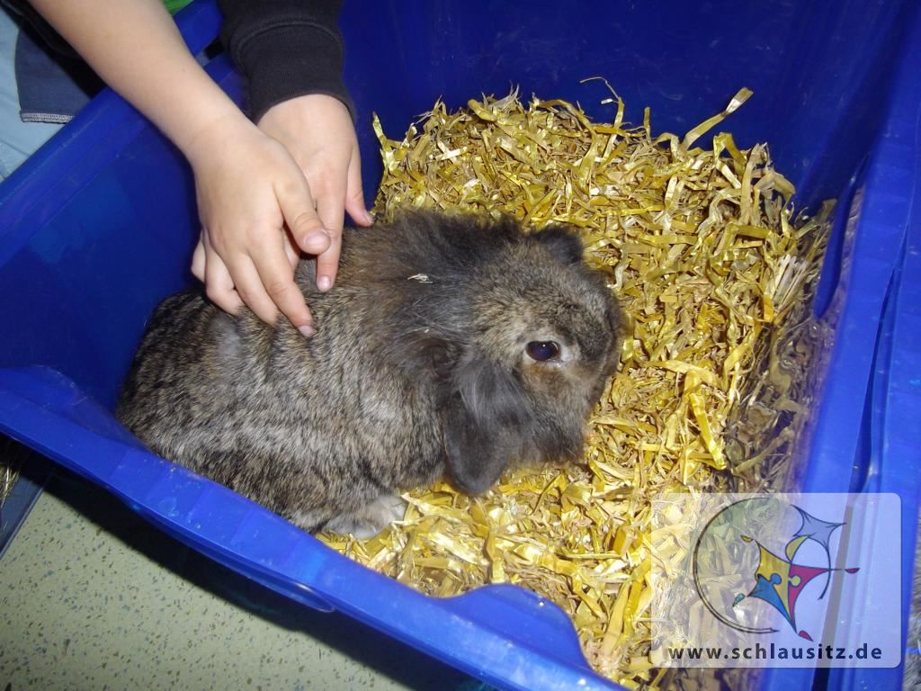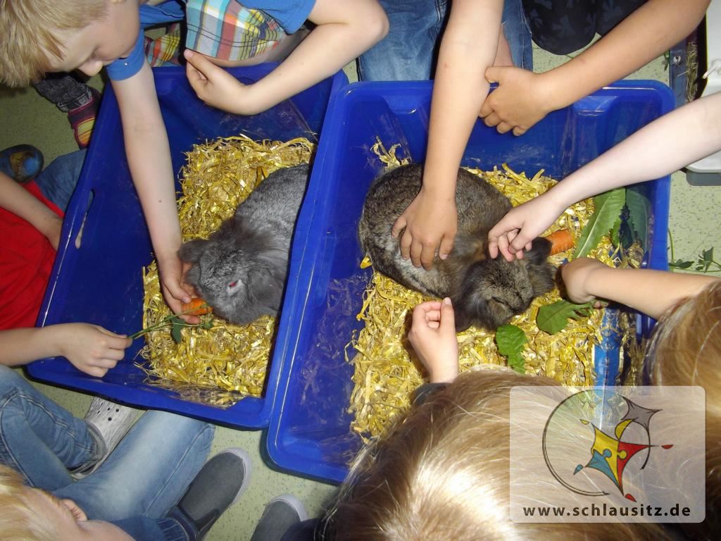 Zwei Kisten, die mit Stroh und Futter ausgelegt waren hatte sie für die Beiden auch dabei. Moritz stellte uns nämlich sein Kaninchen und das von seiner Schwester vor. Das lockte auch die Kinder der Saturnklasse an. Tommi und Laura genossen die vielen Streicheleinheiten der Kinder und machten es sich auf dem einen oder anderen Schoss bequem.