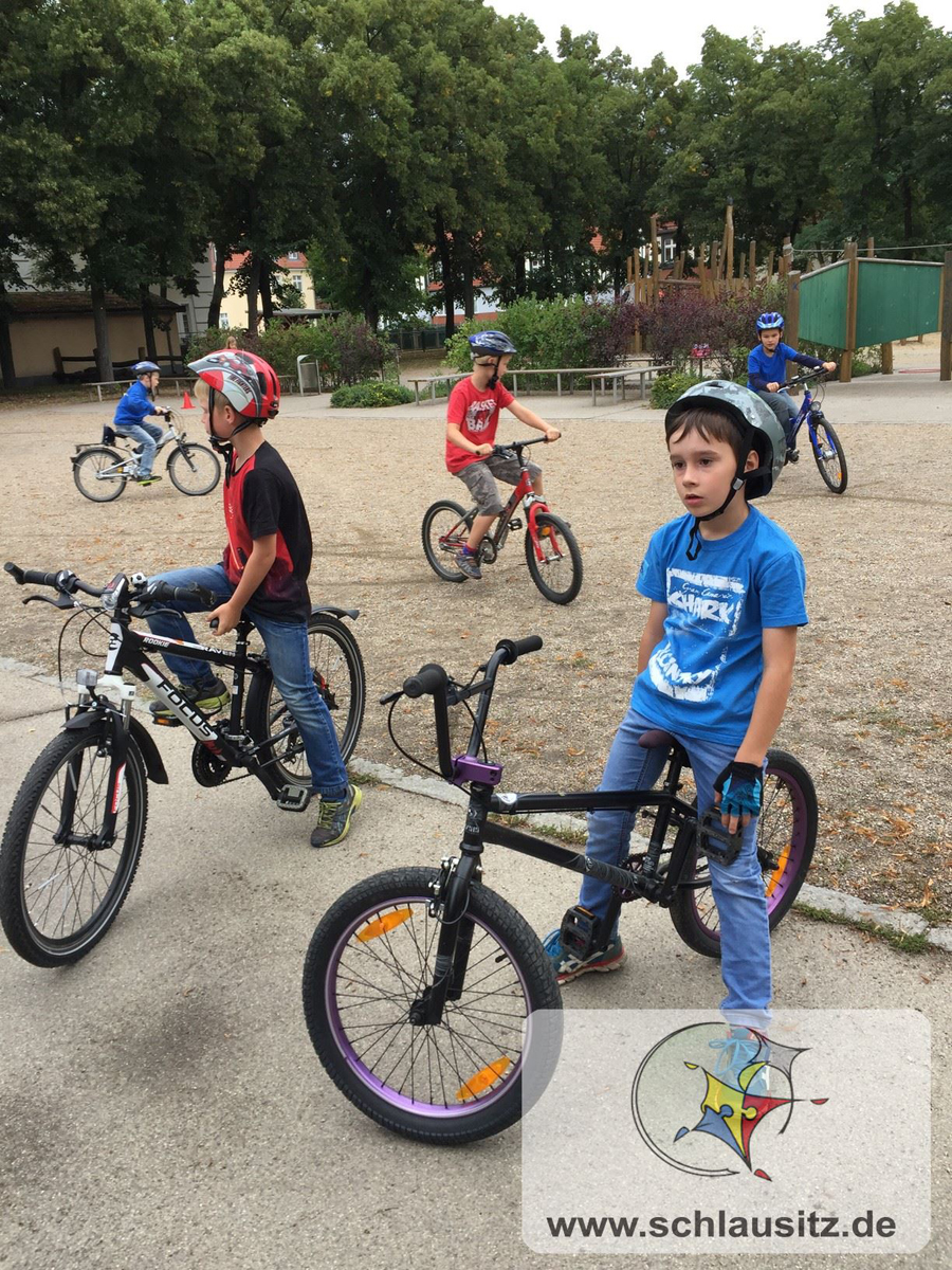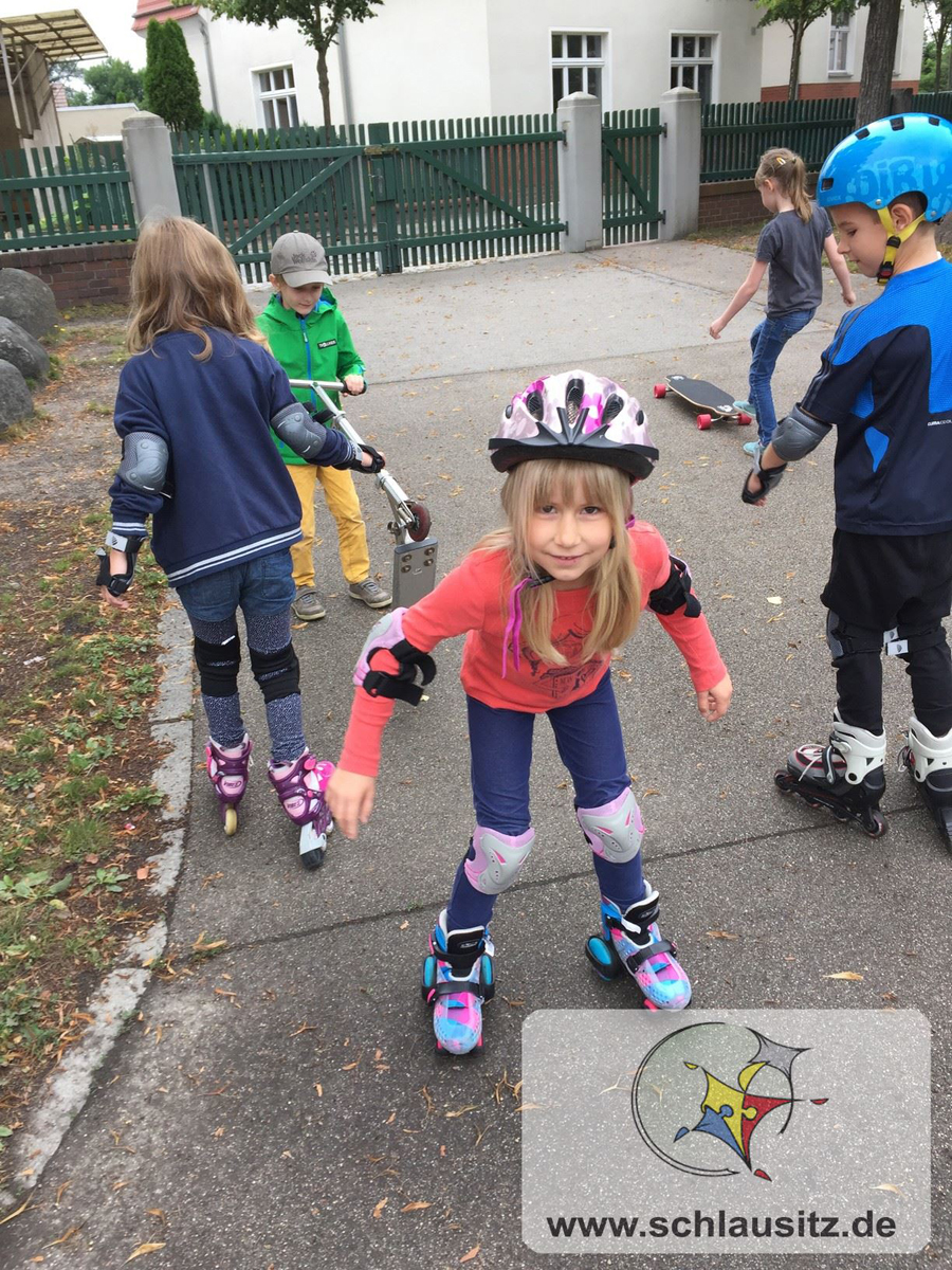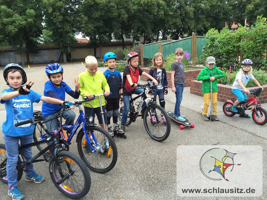 Einen Tag später stellten wir auf unserem Schulhof unseren eigenen Schlausitzring dar und fuhren mit dem Fahrrad, Inlinern, Rollern oder Skateboard über unsere Rennstrecke. Natürlich gab es am Ende auch eine Siegerehrung.