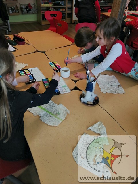 Frau Kroll zeigte den Kindern in den Arkaden, wie man mit wenigem Aufwand seine eigene alte Schatzkarte basteln kann. Nur Papier, Wasser und etwas schmutzigen Sand genügten dazu, um zum Erstaunen der Kinder ein tolles Ergebnis zu erzielen. Die selbstbemalten Schatzkarten wurden für die Eltern im oberen Hortbereich ausgestellt.