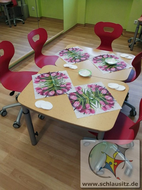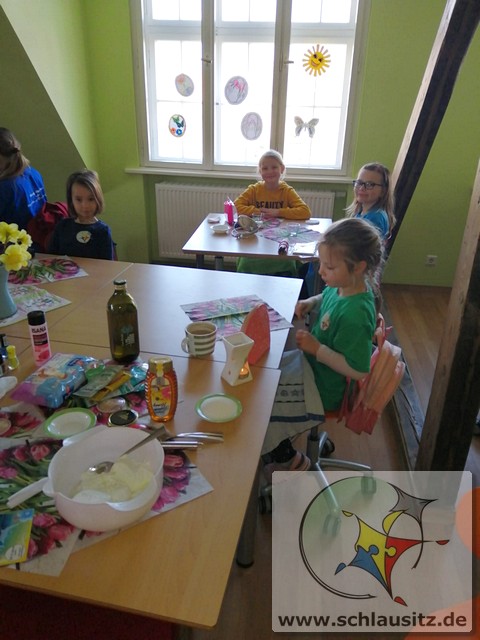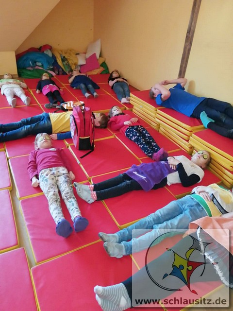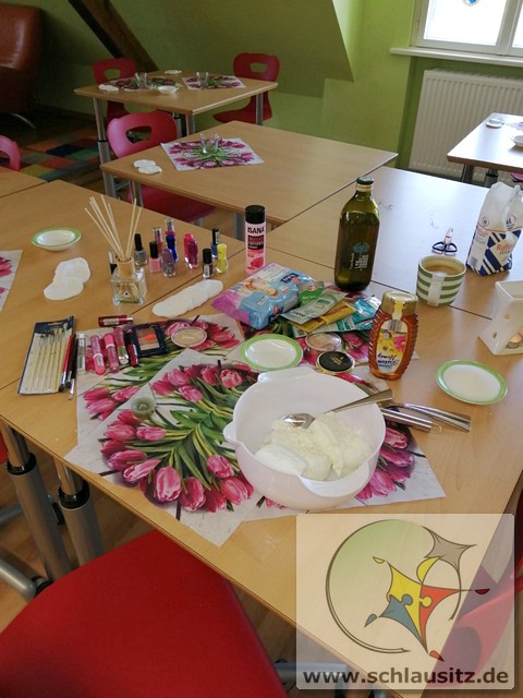 Das Angebot begann mit einem wohlriechenden, liebevoll eingerichteten Wellnessraum begleitet von leisem Wellenrauschen aus dem Player. Die Mädchen stellten unter Anleitung von Frau Kroll eine Quark-Honig-Olivenöl-Maske her, die sie sich dann gegenseitig mit einem Pinsel auf ihr Gesicht auftrugen. Um den Kindern den Entspannungsmodus auch nahe zu legen, ging es danach für 20 min in unseren Ruheraum. Mit Gesichtsmaske und Gurkenscheiben auf den Augen genossen alle 24 Mädchen diese Ruhephase.