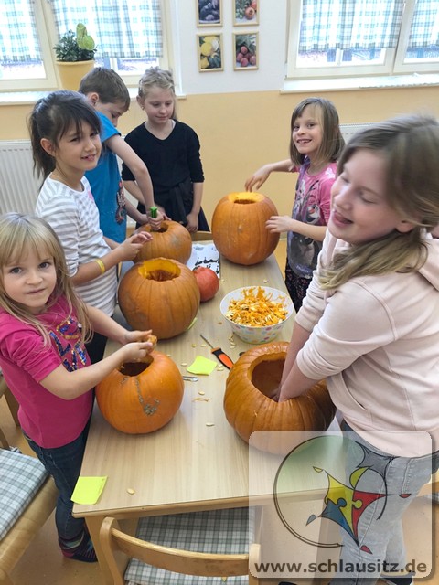 Die zweite Ferienwoche starteten wir ruhig mit einem Spaziergang durch Brieske. Bei schönstem Herbstwetter konnten sich die Kinder u. a. im Park austoben. Dienstag war das Highlight der Woche. Gemeinsam fuhren wir mit dem Bus ins Bowlingcenter. Bei einer leckeren Brause ließen die Kinder die Kugeln übers Parkett rollen und hatten dabei sichtlich Freude. Mittwoch mussten wir aufgrund des schlechten Wetters die Schatzsuche ausfallen lassen. Aber aufgeschoben ist ja nicht aufgehoben. Donnerstag brachte jedes Kind einen tollen Kürbis mit. In der Kinderküche höhlte jeder seinen Kürbis aus, malte ein grusliges Gesicht darauf und schnitze dieses mit Hilfe der Erzieher aus. Ganz tolle Kunstwerke sind entstanden, auf die die Kinder mächtig stolz waren! Freitag bastelten wir in kleiner Runde Sparschweine aus Pappmache. Diese werden im Hort fertig gestellt, denn sie brauchen ja eine Weile zum Trocknen.