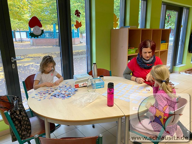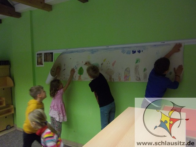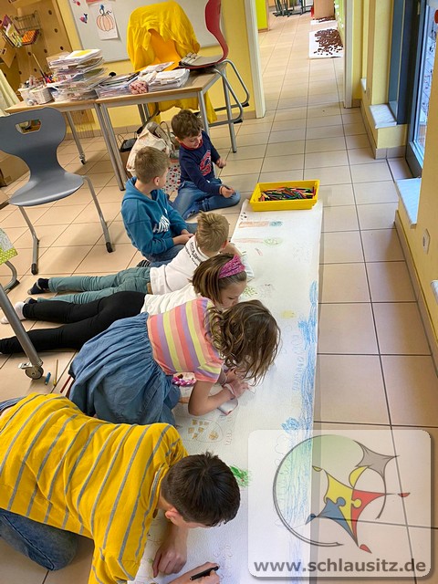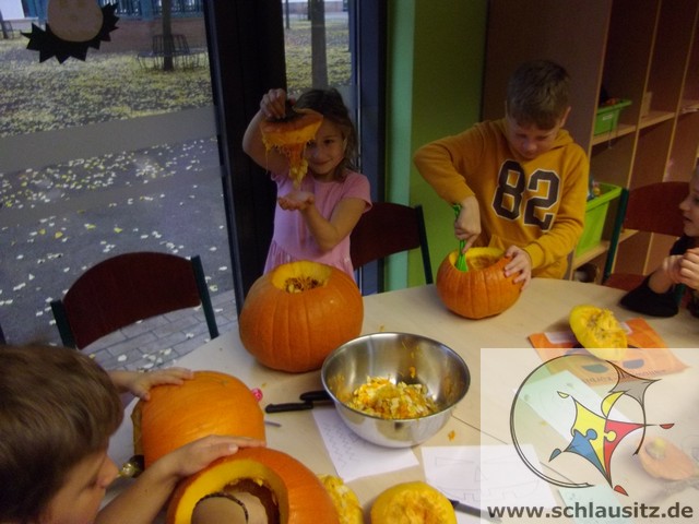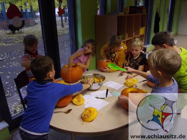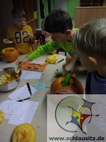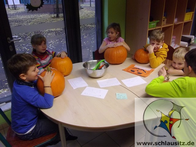 Die Kinder haben am Montag verschiedene Gesellschaftsspiele in den Ferienhort mitgebracht. Sie hatten dann die Möglichkeit diese Gesellschaftsspiele gemeinsam zu spielen. Am Dienstag besuchten wir das Schloss in Senftenberg. Dort wartete eine tolle Überraschung auf die Kinder. Sie konnten ihr eigenes Wappen aus Ton herstellen, woran die Kinder sehr viel Freude hatten. Außerdem erfuhren sie, was es früher alles für Berufe gab. Kreativ wurde es am Mittwoch: jedes Kind bastelte und gestaltete eine Laterne. Donnerstag zauberten alle Kinder ein gemeinsames Herbstbild auf eine Rolle Tapete. Viel Phantasie benötigten die Kinder am Freitag beim Schnitzen ihrer eigenen Kürbisse. Das bereitete allen sehr viel Spaß. Nun sind die Ferien leider schon wieder vorbei!
