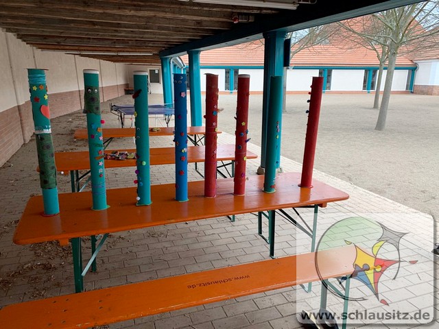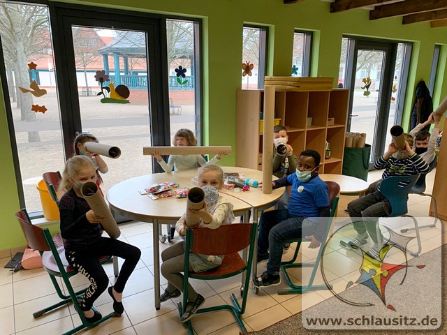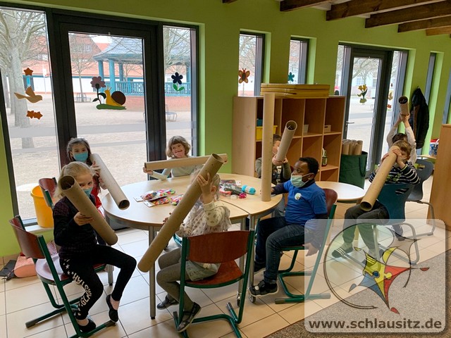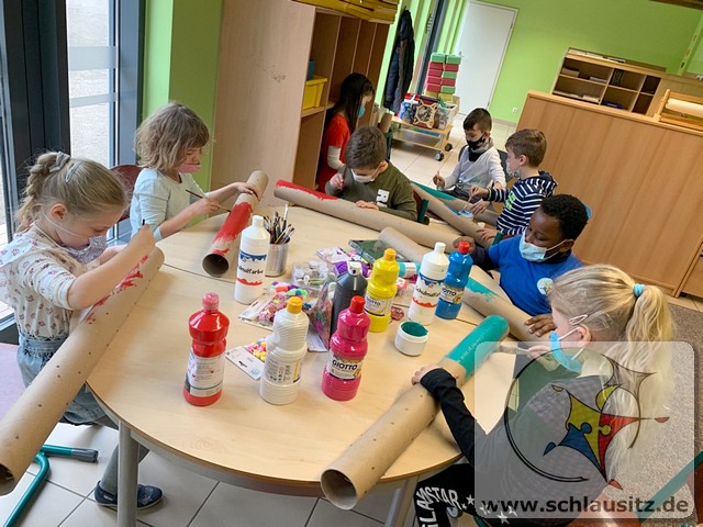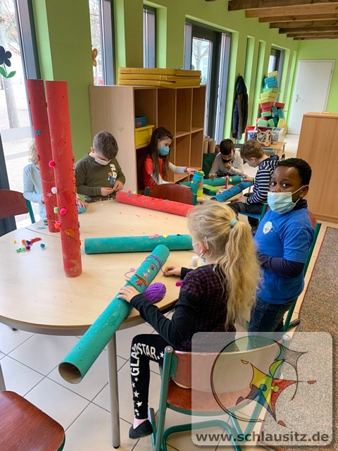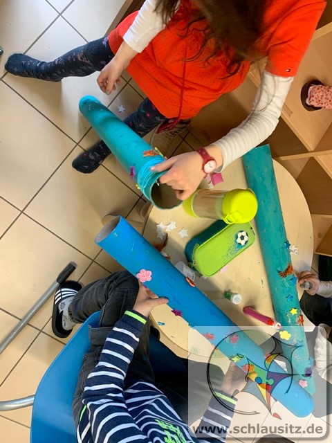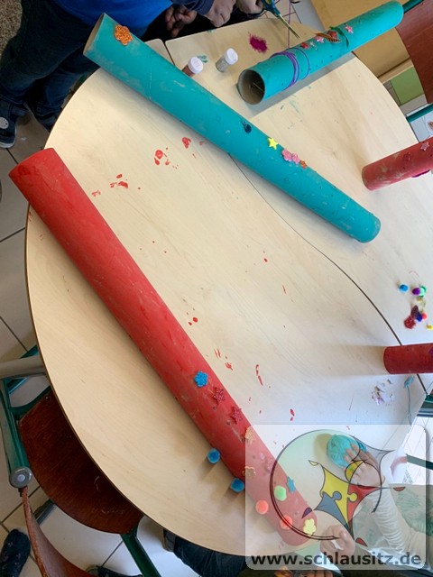Am Montag gestalteten wir aus dicken Architektenrollen unsere eigenen Regenmacher. Eigenständig hämmerten, klebten und malten die Kinder ihre Rohre an. Natürlich mussten die Regenmacher auch getestet werden - und siehe da, es funktionierte. Nachdem die Kinder einige Runden damit über den Schulhof liefen, fing es tatsächlich an zu regnen.