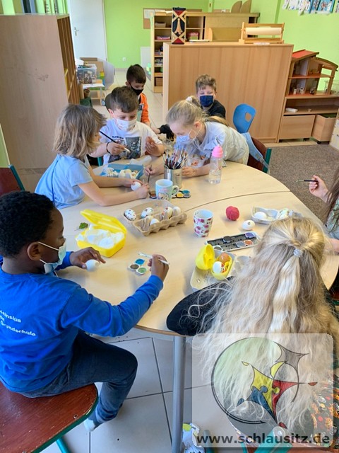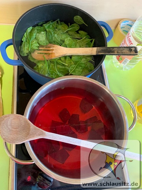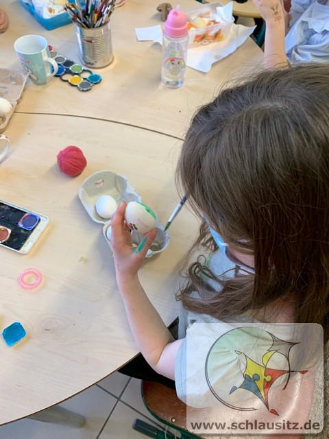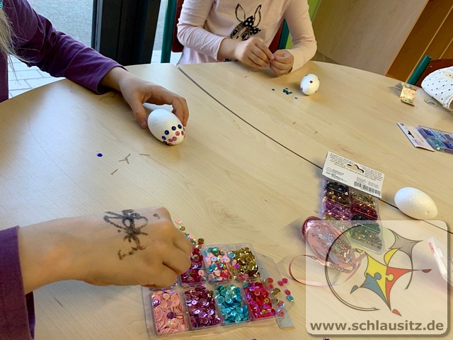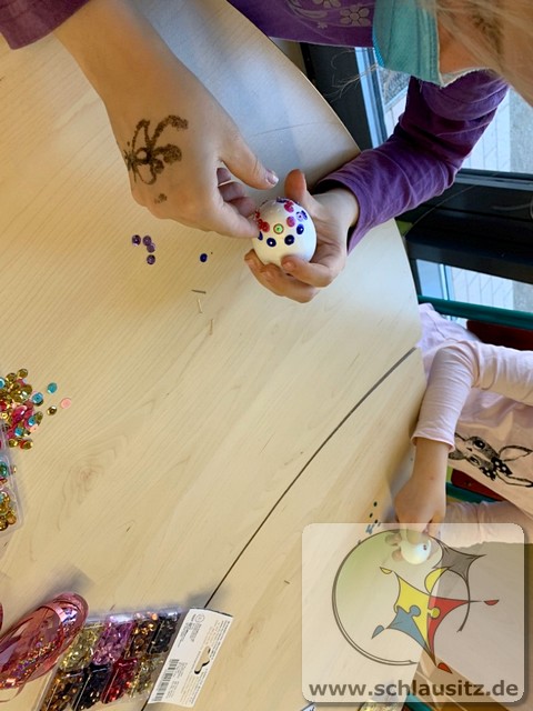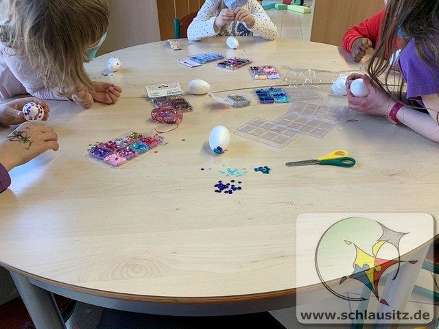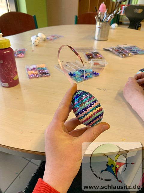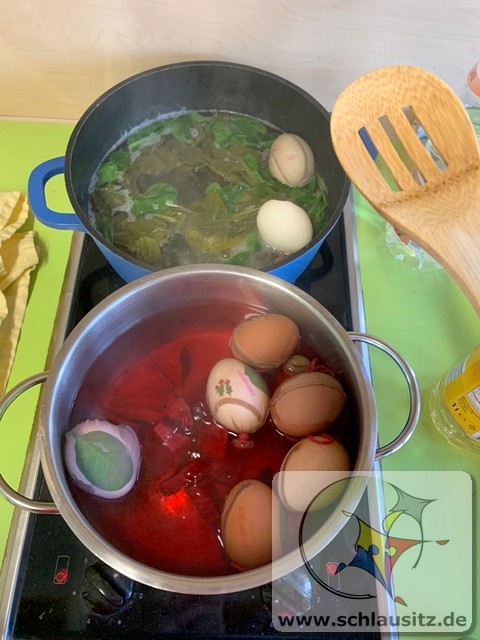 Mittwoch gestalteten wir verschiedene Ostereier. Gemeinsam versuchten wir, die Eier mit natürlichen Materialien zu färben. Aus Spinat, roter Bete, Kurkuma und Zwiebeln stellten wir einen Farbsud her. Leider hat es nicht ganz so geklappt, wie wir uns das vorgestellt haben, aber Versuch macht klug. Die Eier aus Pailletten glitzerten dafür umso mehr.