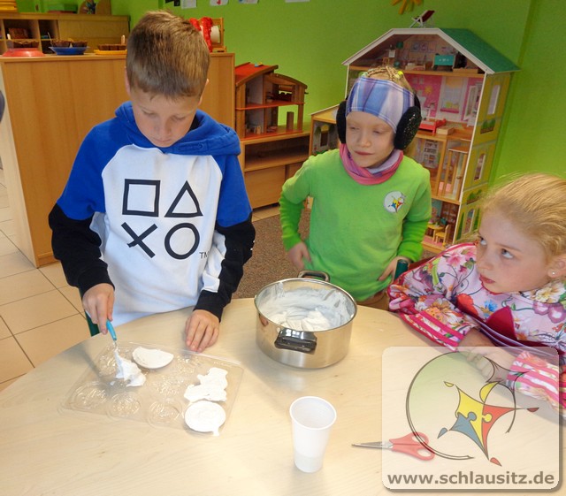 Am Mittwoch starteten wir mit einer Wanderung zum Spielplatz, wo wir uns beim Klettern, Springen und Rutschen austobten. Danach haben wir Gips angerührt und damit Figuren gegossen.