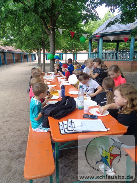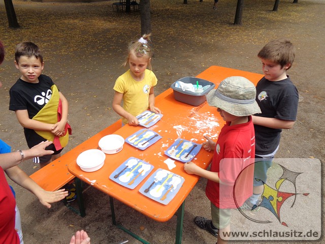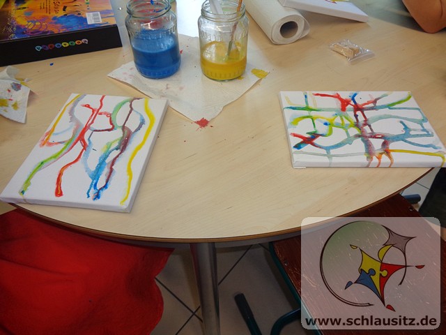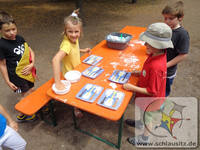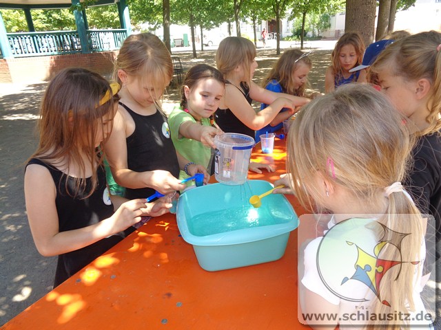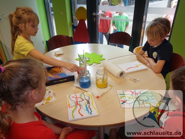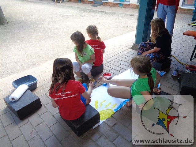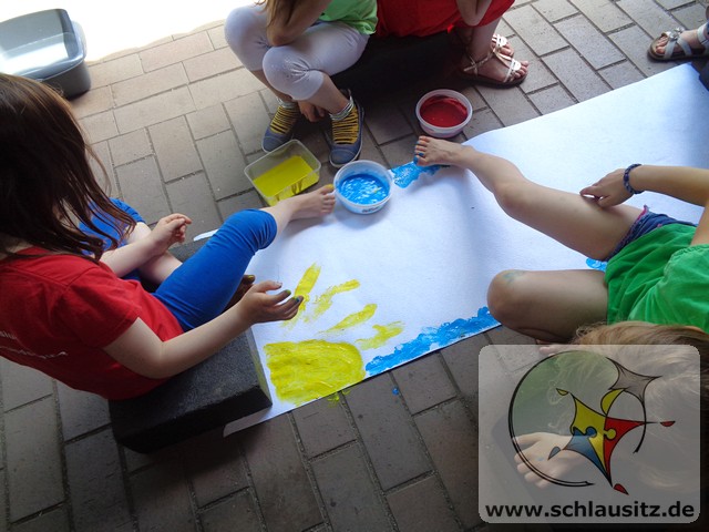 Das schöne Wetter im Juni nutzten wir für viele Angebote an der frischen Luft. Die Kinder experimentierten mit gefärbtem Wasser und Orbeez, fertigten Gipsabdrücke an oder malten auf einer großen ausgerollten Tapetenrolle Kunstwerke mit ihren Zehen. Unteranderem gestaltete die Experimente AG Leinwände ohne dabei zu malen.