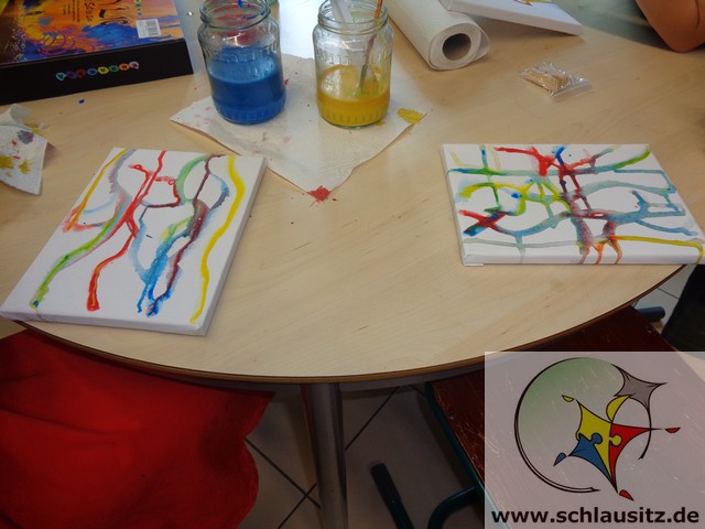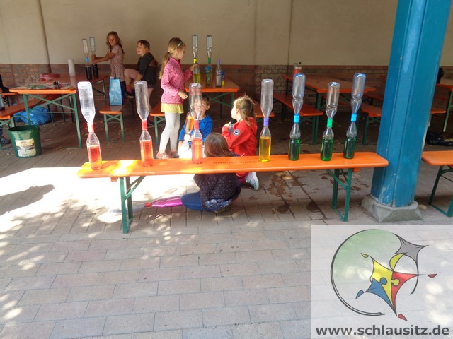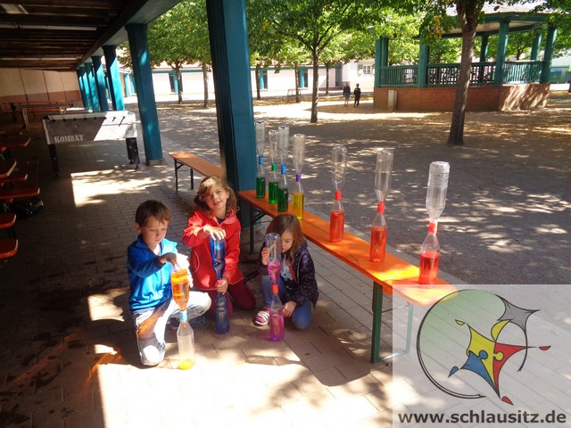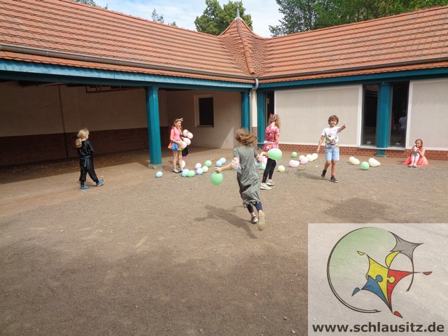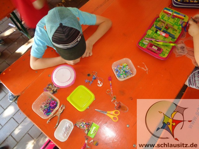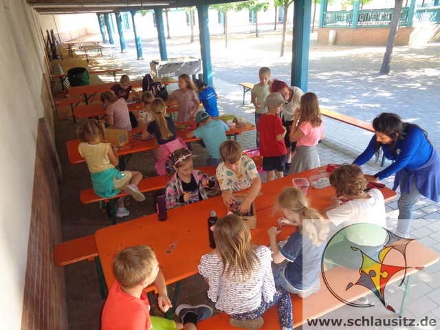 Die ersten Tage der Sommerferien sind vorüber und wir haben schon viel erlebt. Den Start in die Ferien feierten wir mit einer leckeren Bratwurst vom Grill. An den anderen Tagen experimentierten wir mit Wasser und Farbe. Jedes Kind bastelte sich seinen eigenen Tornado und wir gestalteten bunte Leinwände für unseren Hortraum - ohne Malen! Zusammen mit Frau Rösler bastelten die Kinder tolle Schlüsselanhänger. Wir feierten eine Sommerfaschingsparty und machten Ausflüge zum Senftenberger See, zum Spielplatz und ins Hallenbad nach Lauchhammer.