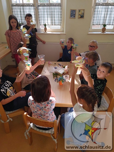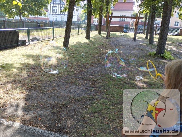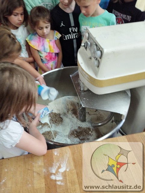 In der dritten Sommerferienwoche erlebten wir wieder abwechslungsreiche und spannende Aktivitäten. Am Montag starteten wir erfrischend. Gemeinsam bereiteten wir uns bunte, fruchtige Cocktails zu, perfekt zur sommerlichen Stimmung. Am Dienstag ging es auf einen besonderen Ausflug zur Krabatmühle nach Schwarzkollm, wo wir unser eigenes Brot backen durften. Dabei lernten wir viel über die traditionelle Handwerkskunst und konnten am Ende unser eigenes, frisch gebackenes Brot mitnehmen. Der Mittwoch stand ganz im Zeichen des Wassers! Bei tropischen Temperaturen hielten wir es am See gut aus. Am Donnerstag machten wir uns auf den Weg nach Schwarzheide ins Kino. Beim Film „LILO und STITCH“ ließen wir es uns mit Popcorn und kühlen Getränken gut gehen. Zum Abschluss der Woche führten wir am Freitag spannende Experimente mit Seifenblasen durch. Dabei entstanden riesige, schillernde Blasen, die wunderschön im Sonnenlicht glänzten.