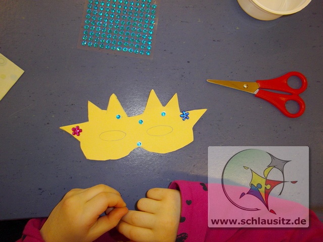 Heute gestalteten wir Schlaumäuse eine tolle Maske. Zuerst haben wir sie ausgeschnitten. Das war ganz schön schwierig, denn es gab viele Ecken, Zacken und Kurven. Doch mit viel Ausdauer haben wir geschafft, nur bei den Augen hatten wir Hilfe.