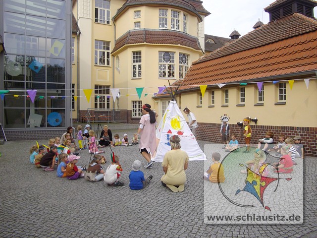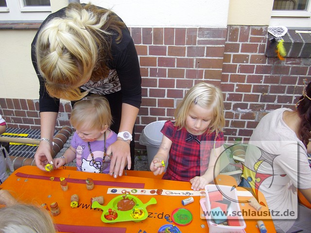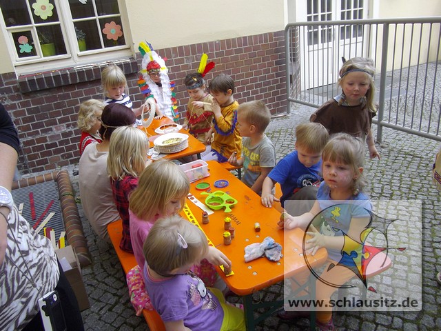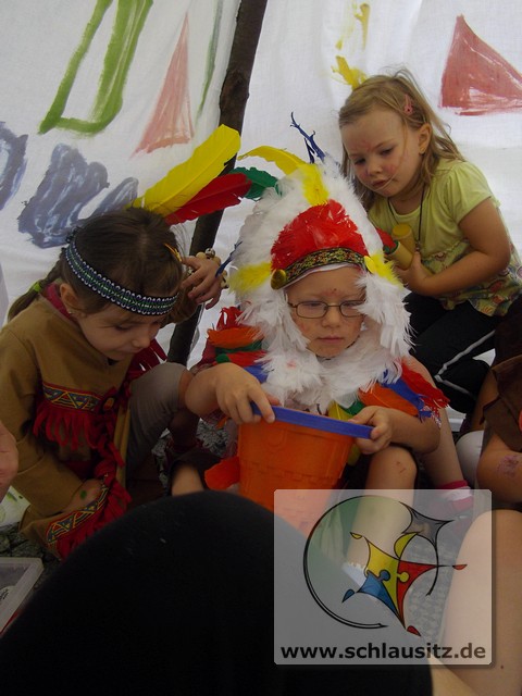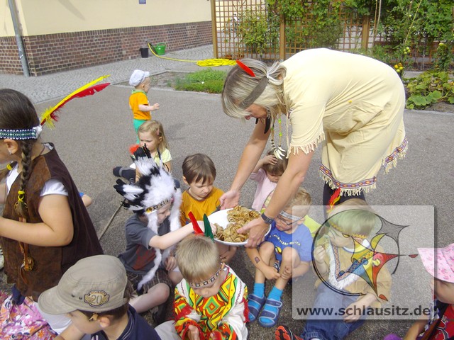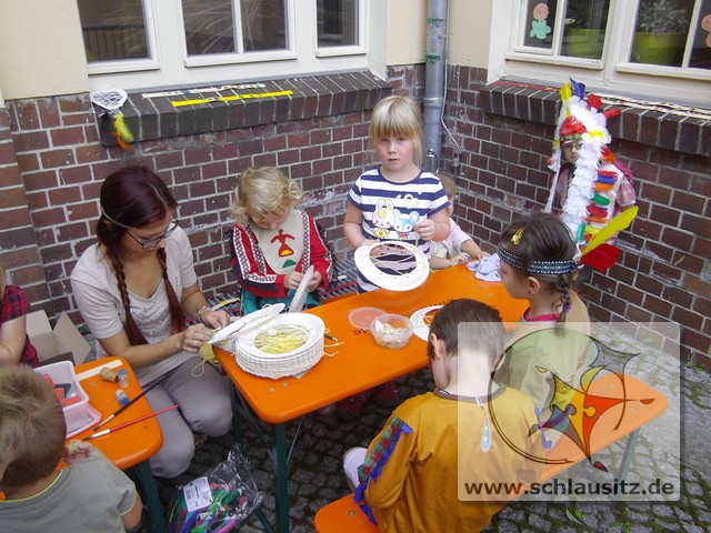 Ein passendes Stirnband haben wir uns selbst gebastelt. Auch Traumfänger konnten wir uns herstellen. Der Medizinmann hat die neugierigen Indianer in sein Tipi eingeladen und eine unterhaltsame Mitmachgeschichte vorgetragen. Da uns so viele Abenteuer ganz schön hungrig und durstig gemacht haben, gab es zur Stärkung zwischendurch leckere „Hirseplinse" und „Feuerwasser".