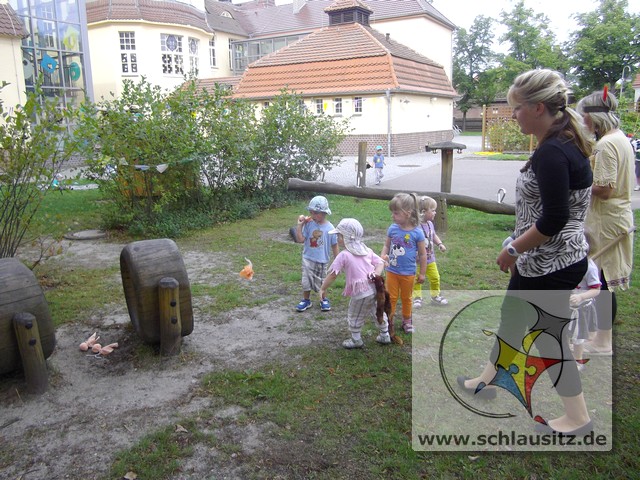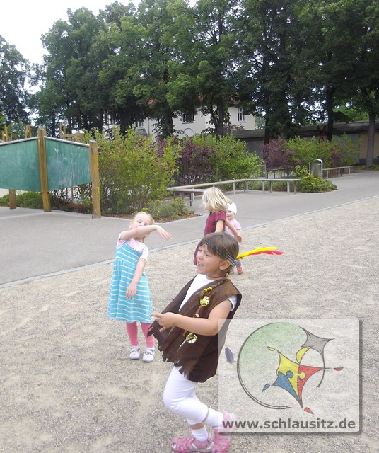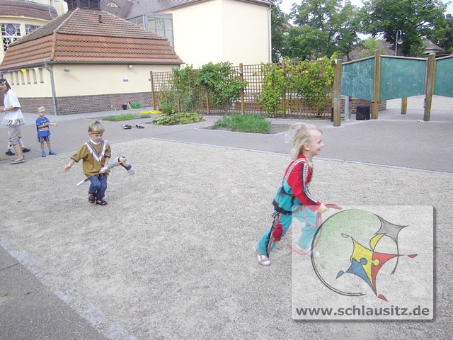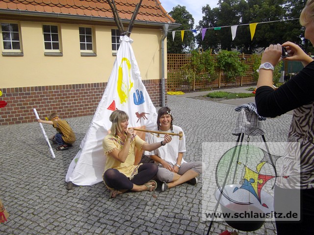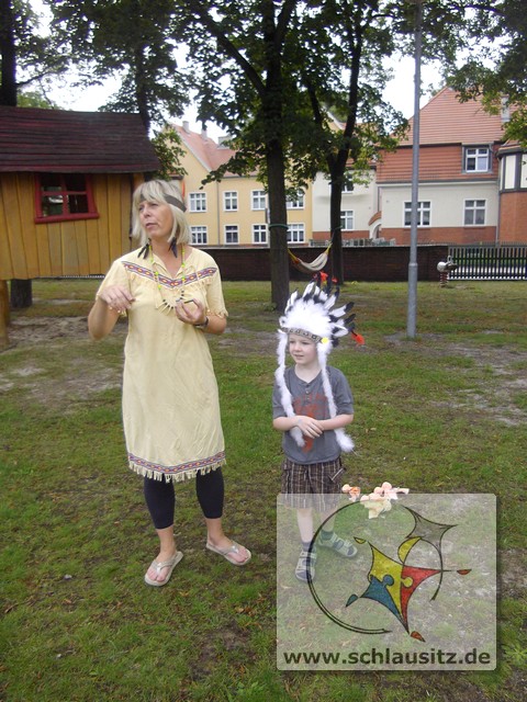 Begrüßt hat uns kleine Indianer der großartige Medizinmann „Schwarzer Adler". Danach tanzten wir alle gemeinsam den Sonnentanz. Um auch in den Stamm der Indianer aufgenommen zu werden, warteten kleine Prüfungen auf uns. Zuerst sollte ein kleines Pony eingefangen werden. Auch das Spurenlesen gehörte zu den zu bestehenden Aufgaben. Um zu testen, ob wir auch gute Jäger sind, musste ein „Bola" durch Holzreifen geworfen werden. Wer mindestens einen dieser Tests bestanden hat, erhielt endlich seinen Indianernamen.