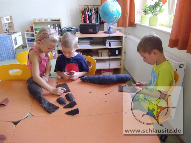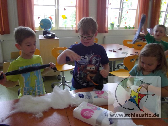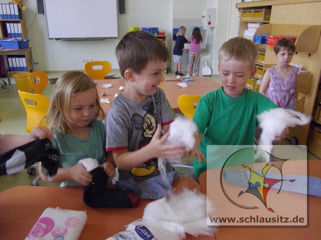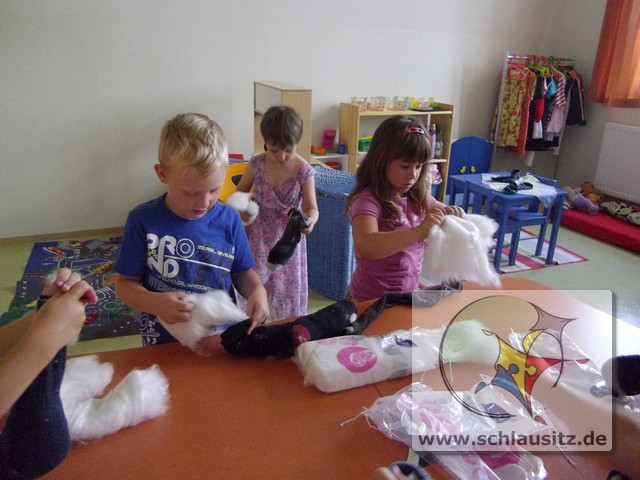 Aus alten Socken, Watte, Filz, Toilettenpapierpappen, Farbe und Tonpapier entstanden die einzelnen Teile, welche dann mit der Klebepistole zu einem Ganzen verbunden wurden. Ein langer gerader Stock komplettierte unser „Reitpferd". Den ersten Proberitt haben wir Entdeckerzwerge auch schon geschafft. Na, wer hat Lust, es uns gleichzutun?