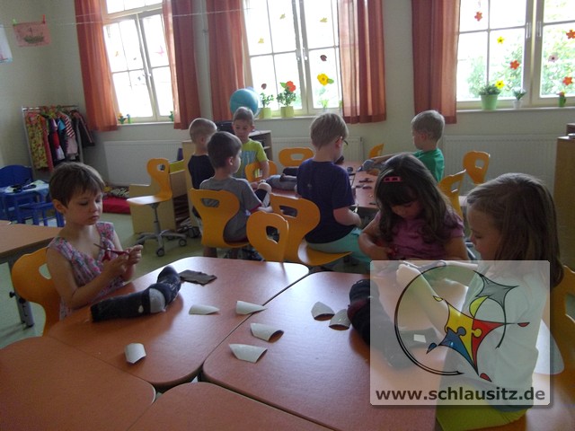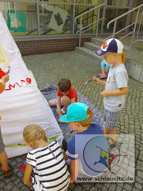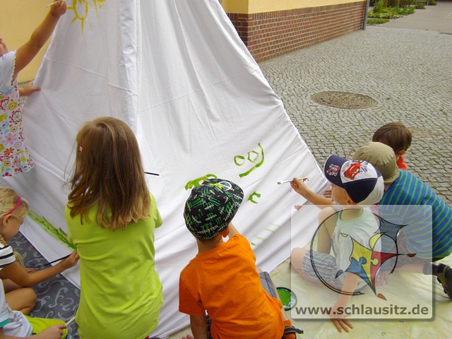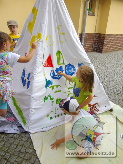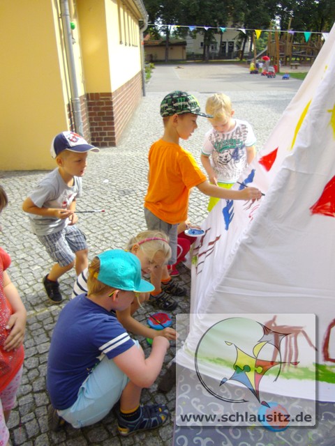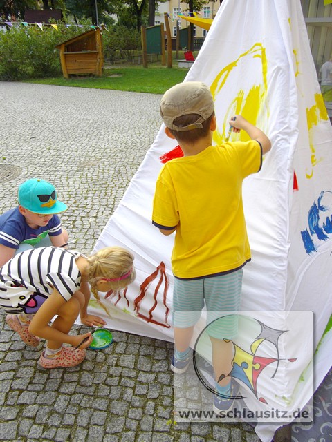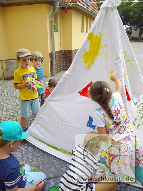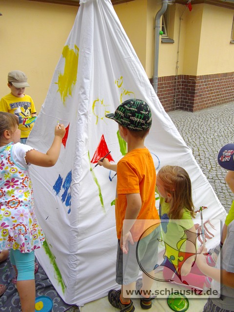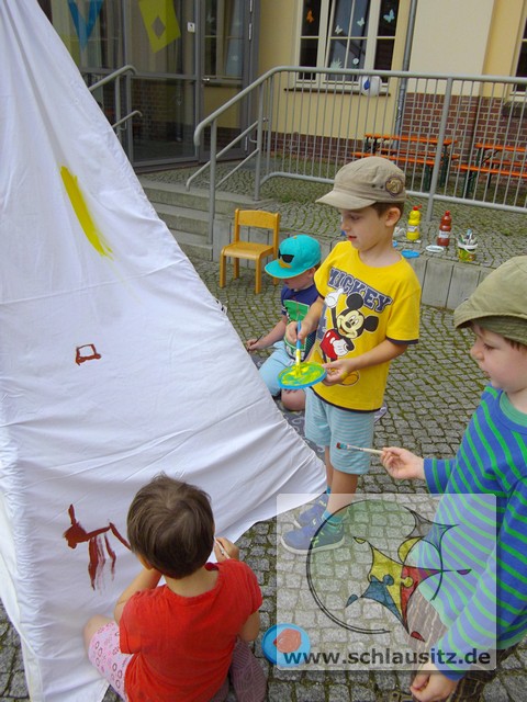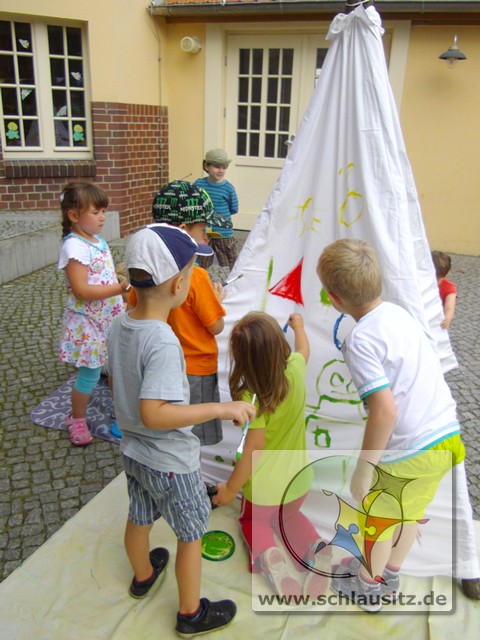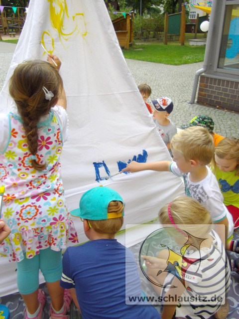 Natürlich gehört zu einem richtigen Indianerfest auch ein großes Tipi, so heißt das Wohnhaus der Indianer. Deshalb haben wir Entdeckerzwerge unsere Ärmel hochgekrempelt und ein riesiges, buntes Tipi aufgebaut und bemalt. Das war ganz schön kompliziert, aber gemeinsam haben wir es geschafft.