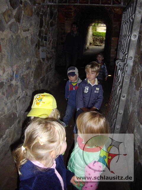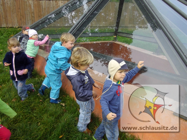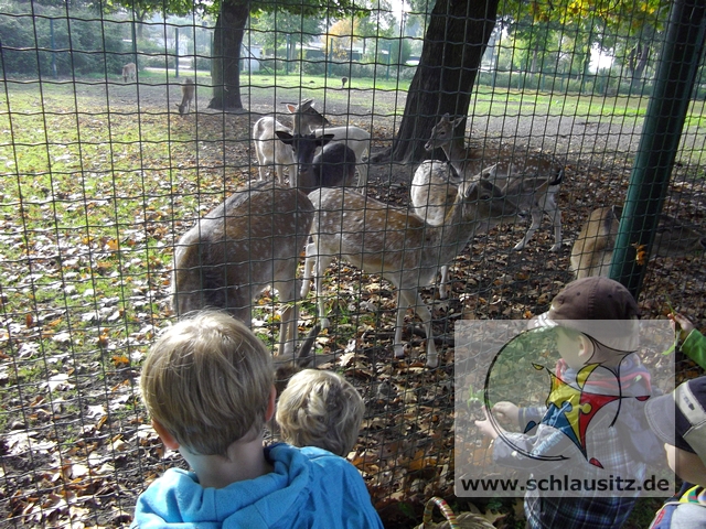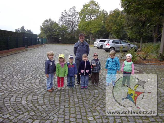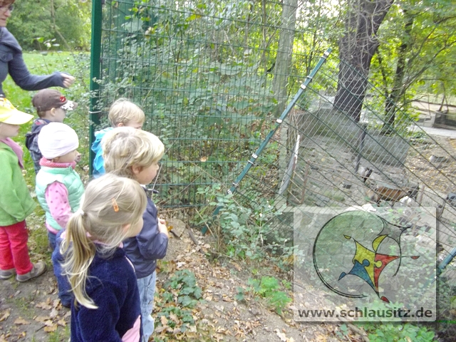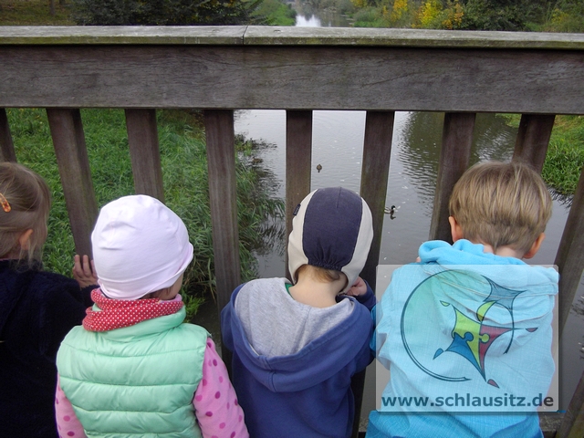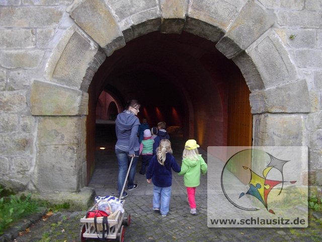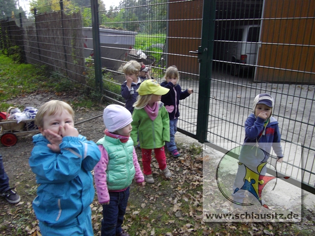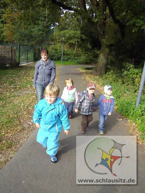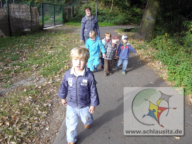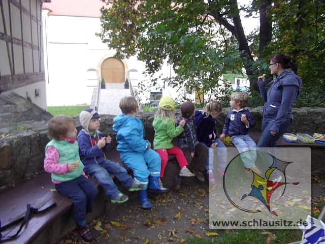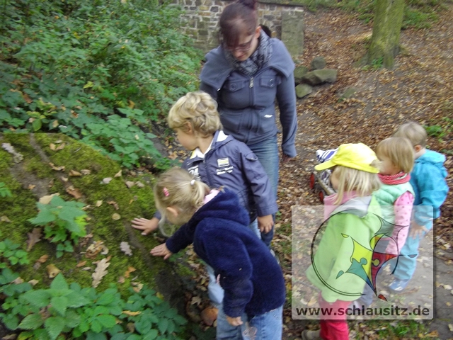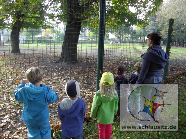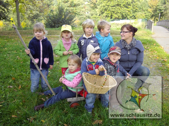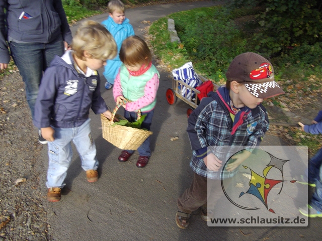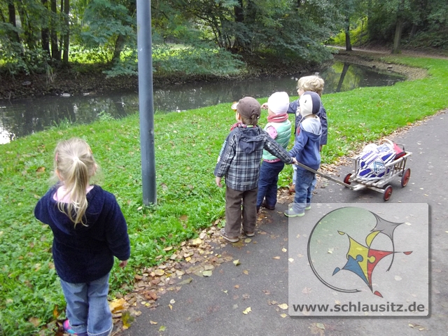 Mit Hilfe von Herr Münchow und Frau Hanf konnte die Hin- und Rückfahrt organisiert werden. Ziel war der Senftenberger Schlosspark. Mit Bollerwagen und Regensachen ausgerüstet, ging es dort auf Entdeckertour. Vieles gab es zu beobachten, u.a. die Enten, die auf der Schwarzen Elster schwammen oder die Ziegen am nahgelegenen Tierpark. Ein besonderes Erlebnis war das Durchqueren des großen Schlosstors. Und weiter ging es. Viele Herbstfrüchte wurden gesammelt und verstaut.