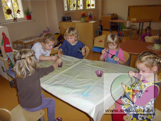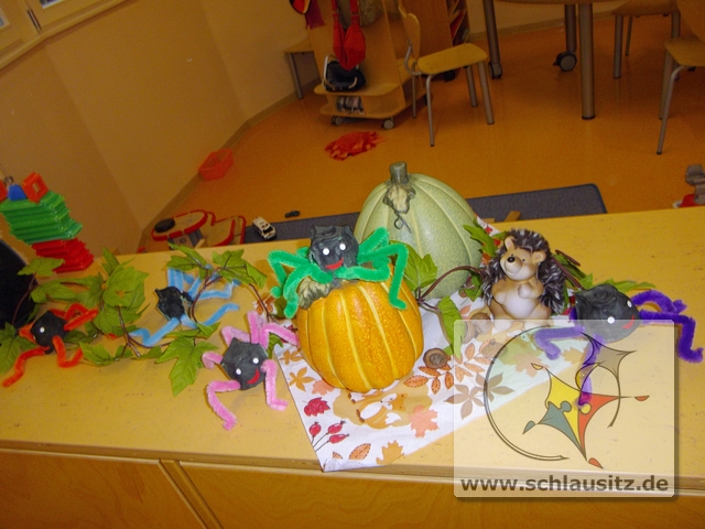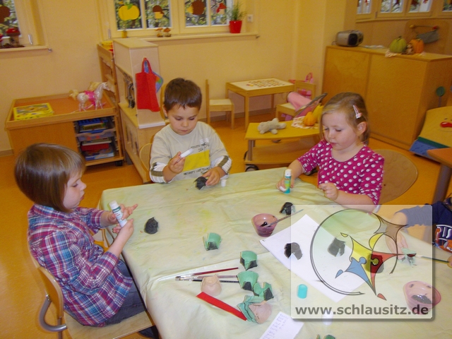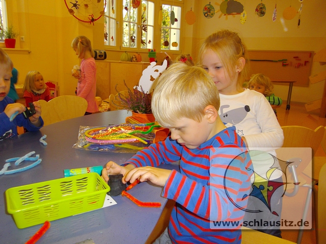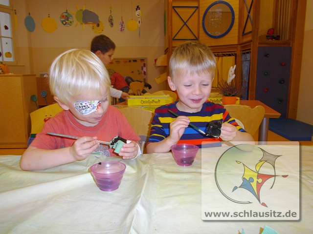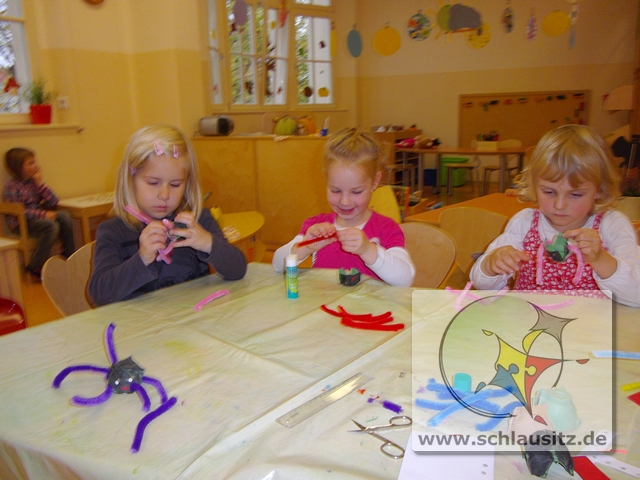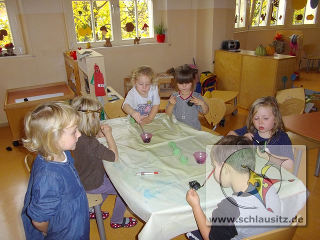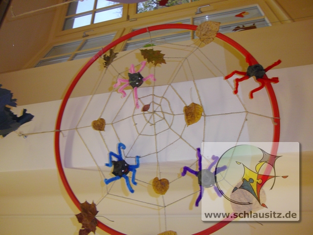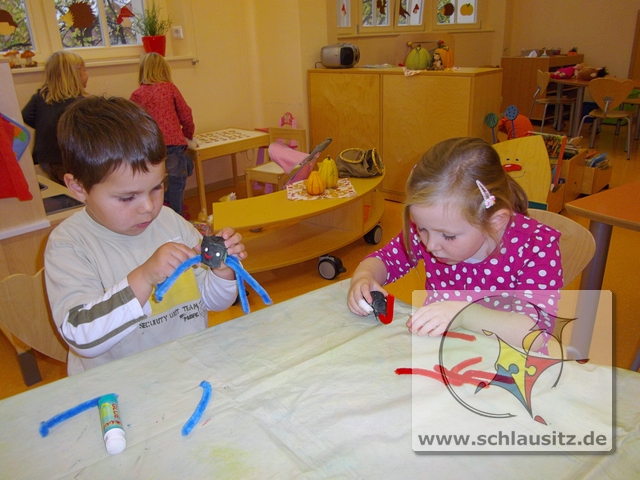 Wir Schlaumäuse haben einen Eierkarton als Körper für die Spinne ausgeschnitten und mit dem Pinsel schwarz angemalt. Nach dem Trocknen klebten wir vorsichtig die Augen und den Mund auf. Schon bekam unsere Spinne ein freundliches Gesicht.