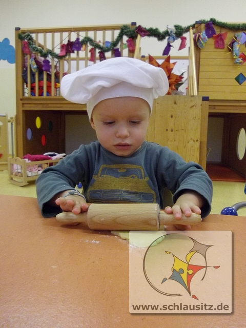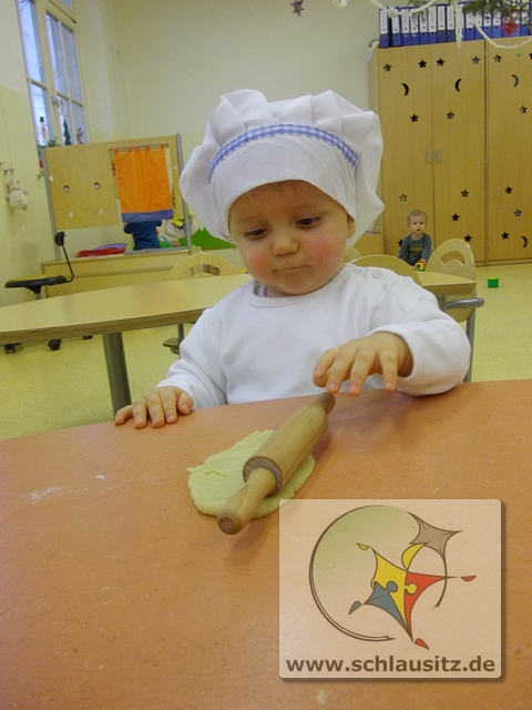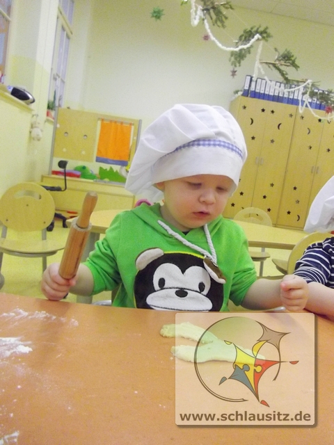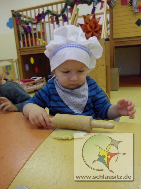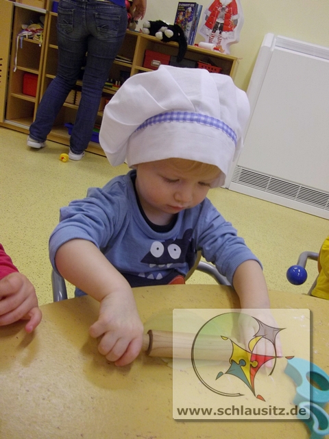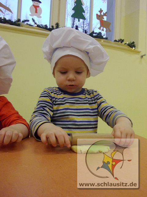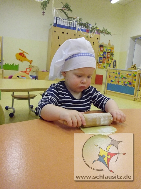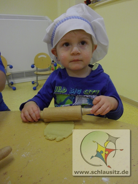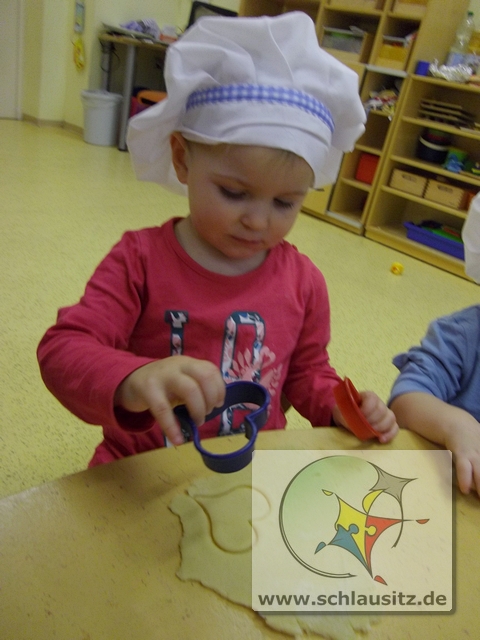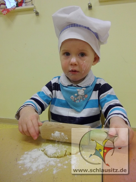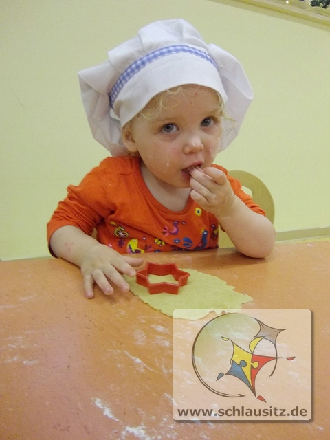 Mit Bäckermütze, Nudelholz und tollen Ausstechförmchen ausgestattet gingen wir ans Werk. Das Ausrollen des Teiges und Ausstechen der Formen war gar nicht so einfach, hat uns allen aber viel Spaß bereitet. Sehr lustig war auch, dass nicht nur der Teig sondern auch unsere Gesichter mit Mehl eingepudert waren. Der Teig wurde natürlich auch vorgekostet.