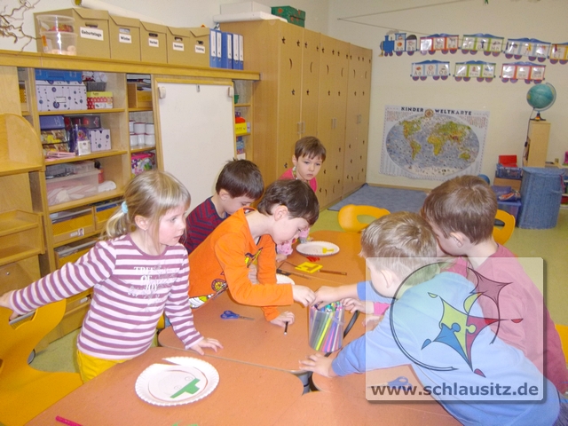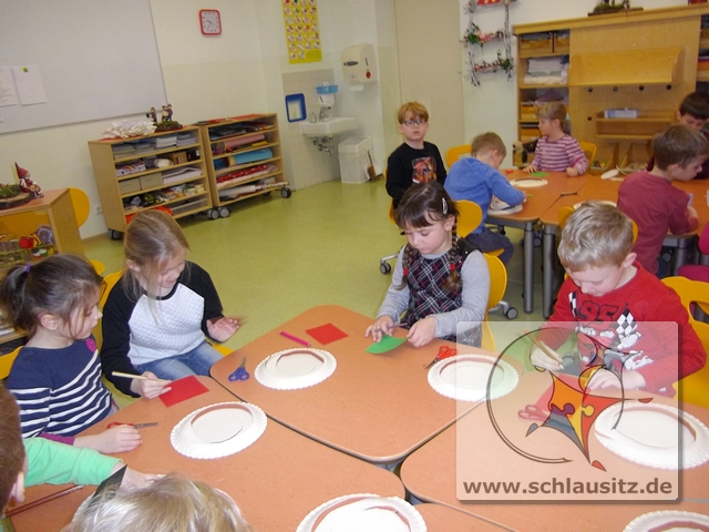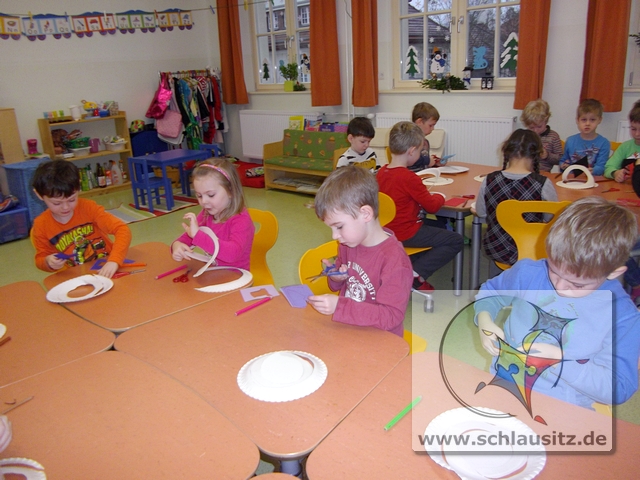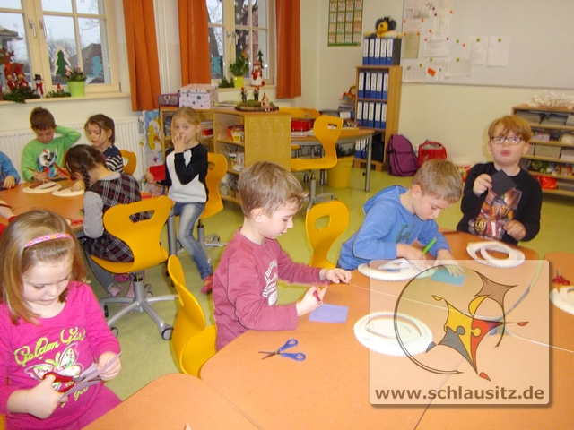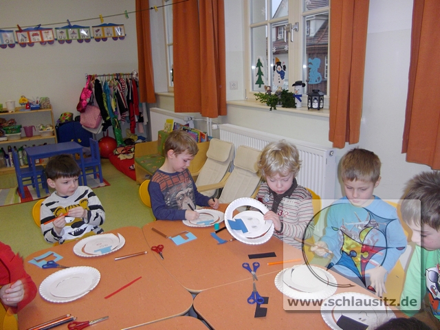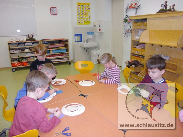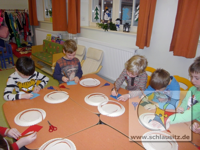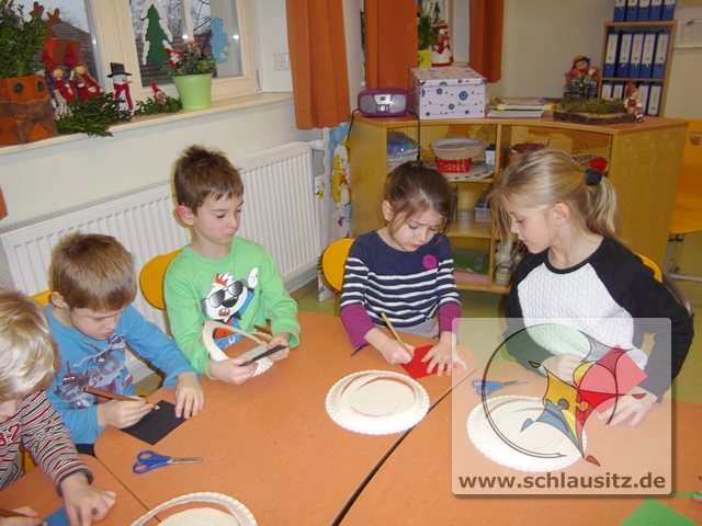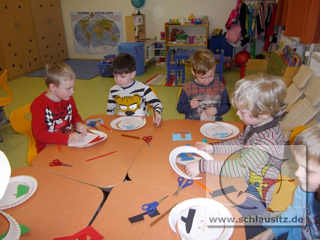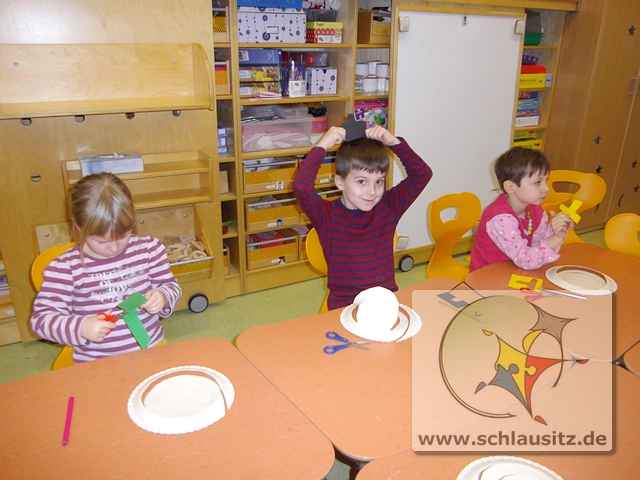 Dann basteln wir uns doch einen tanzenden Schneemann. Jeder Entdeckerzwerg hat aus einem Teller ein tolles Schneemannmobile ausgeschnitten. Anschließend verzierten wir unsere Figur mit einem Hut und zeichneten ein Gesicht ein.
