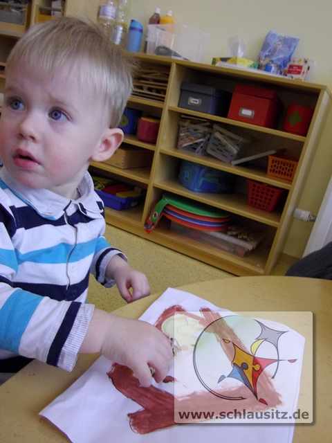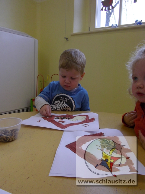 Auch auf Blättern haben wir ein Vogelhaus gestaltet. Dafür haben wir das vorgemalte Vogelhaus erst mit einem Pinsel und Farbe braun angestrichen. Dann haben wir einen Vogel und Körnchen in das Haus geklebt.