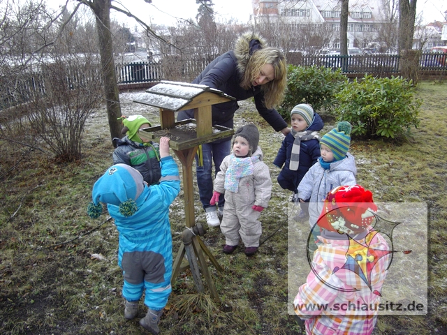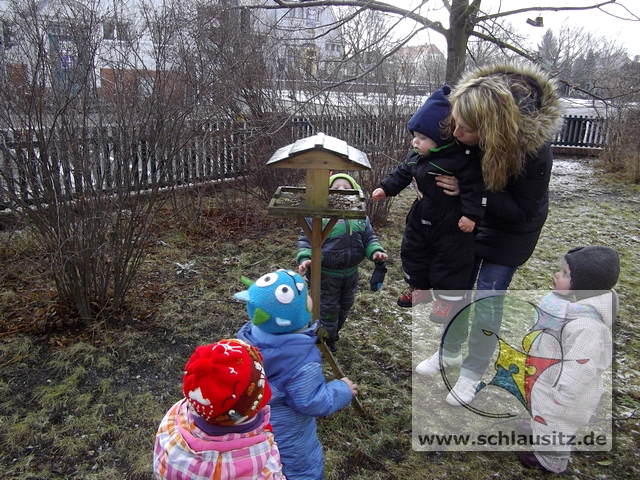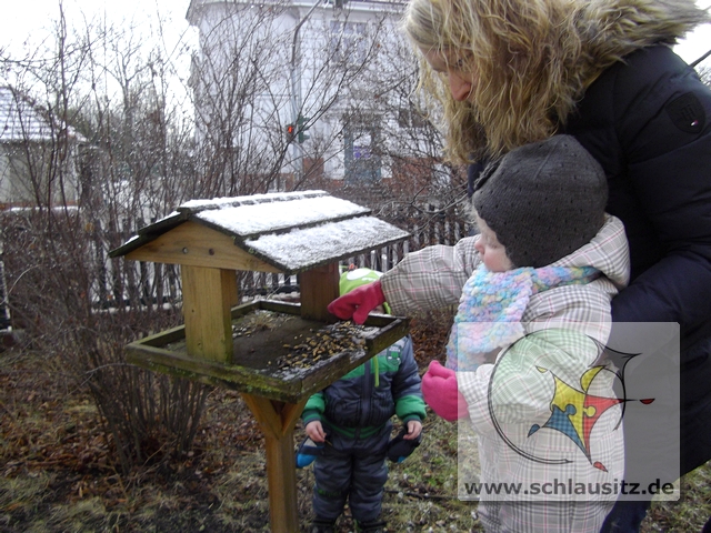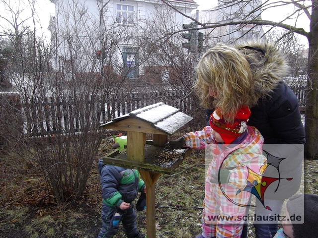 Kita Kinder befüllen VogelhausWas essen denn die Vögel, wenn draußen Schnee liegt?