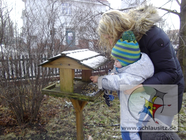 Von unserem Fenster aus können wir das Vogelhaus im Garten beobachten. Dieses haben wir mit Vogelfutter befüllt.