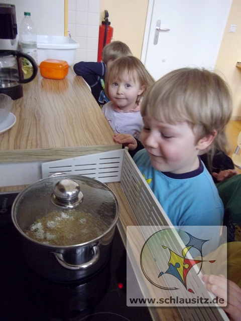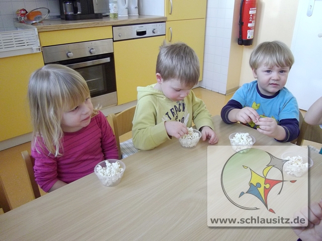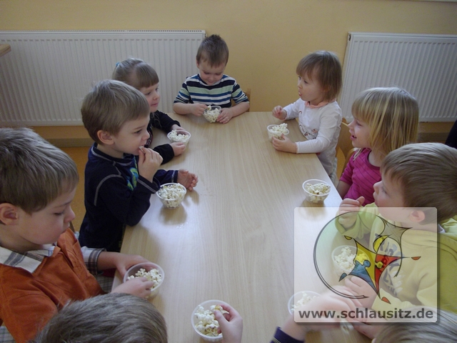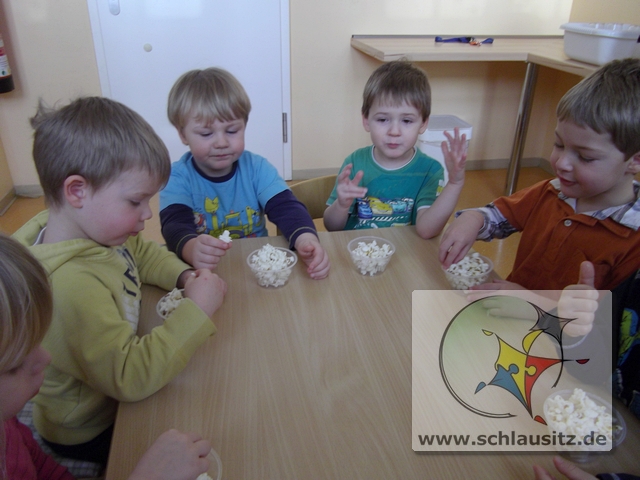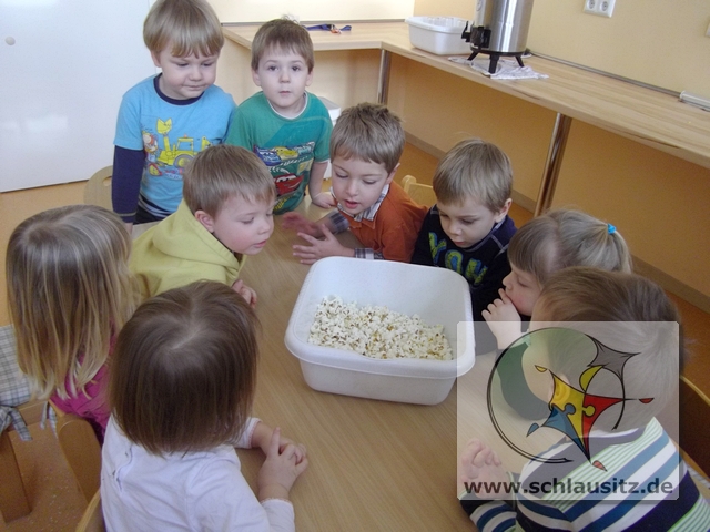 Eigentlich haben wir die Jahreszeit Winter und die Landschaft müsste weiß gepudert sein. Aber es schneit einfach nicht. So haben wir Grashüpfer uns Schnee gezaubert. Naja richtig zaubern können wir ja nicht. Mit Hilfe fleißiger Kinder entstand in der Kinderküche Popcorn. Und das Allertollste ist: „Popcorn sieht aus wie Schnee und schmeckt dazu noch lecker."