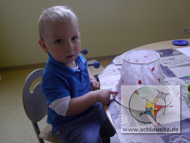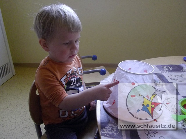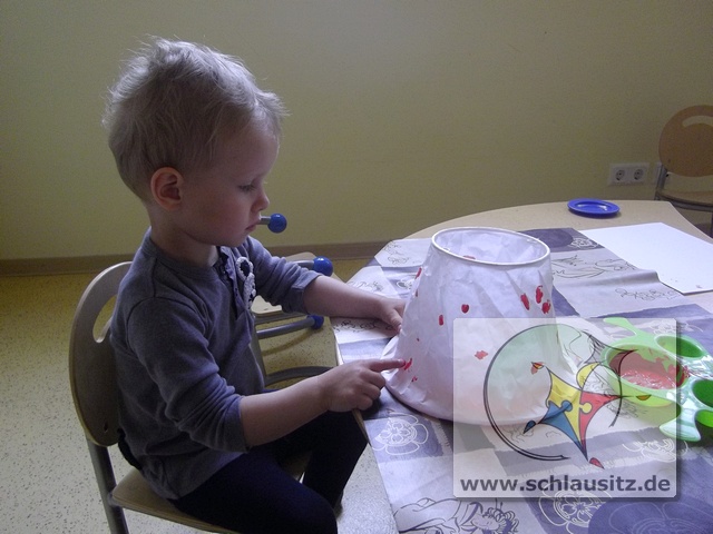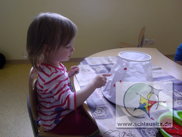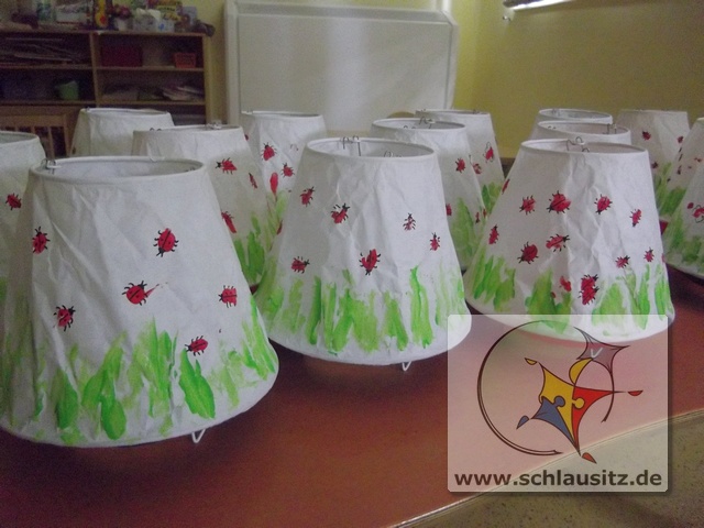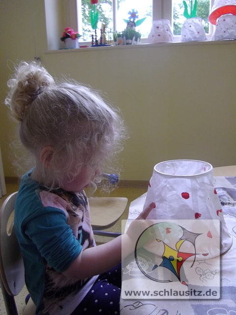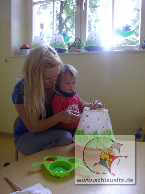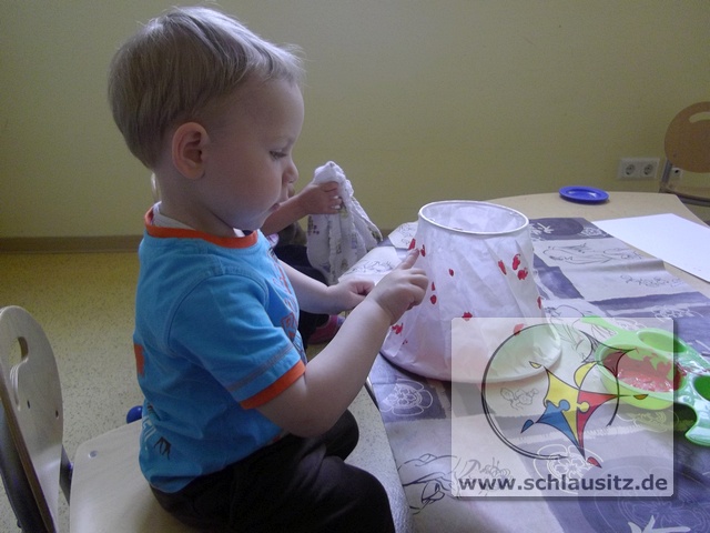 Mit unseren kleinen Fingern haben wir vorsichtig, damit das dünne Papier nicht kaputt geht, rote Farbe auf den Lampenschirm getupft und mit dem Pinsel eine grüne Wiese drauf gemalt.